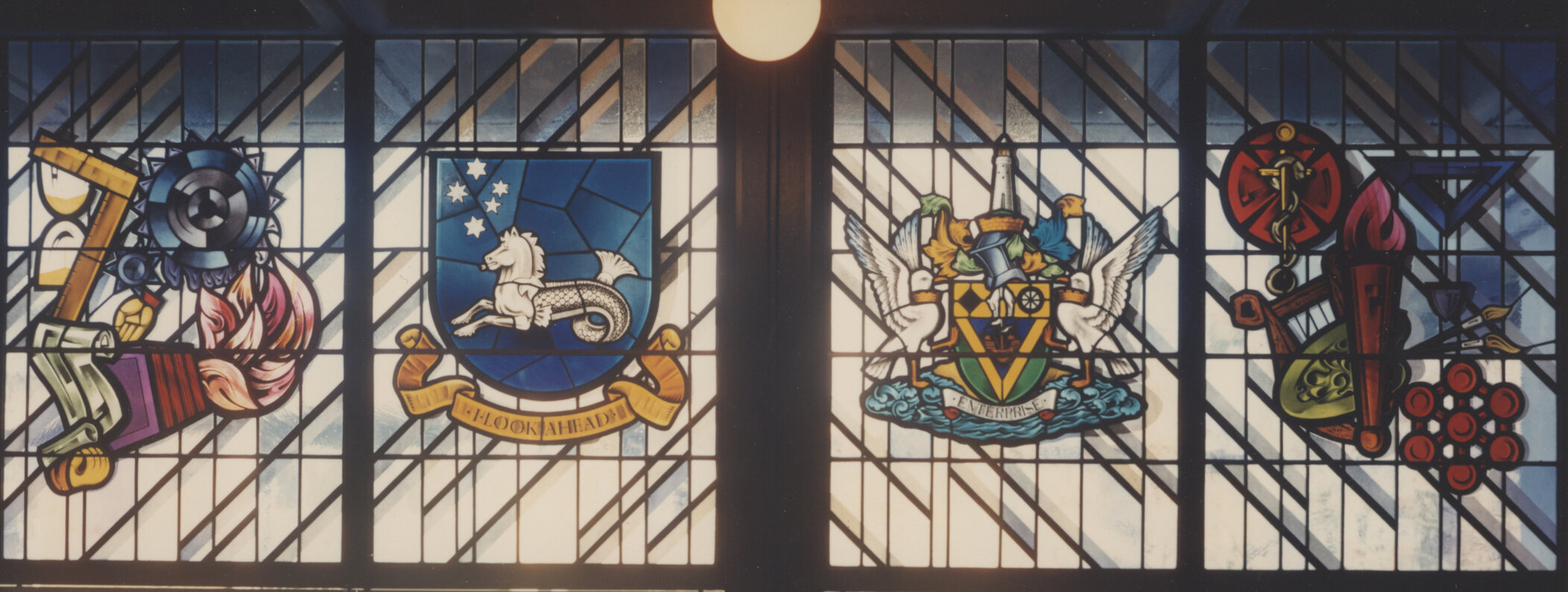 Glass panels above main doors of Great Hall, University of Newcastle, Australia: c. 1975
