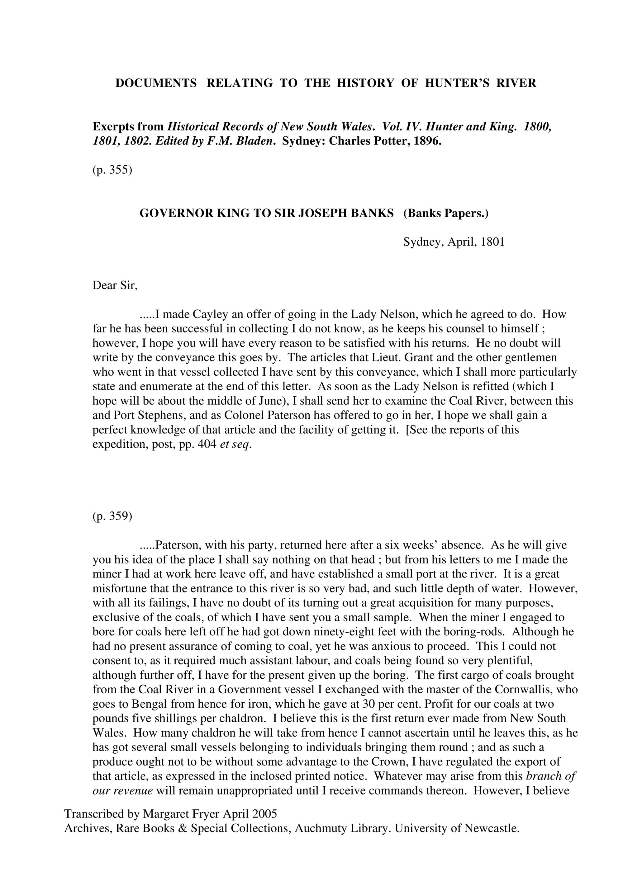Governor King to Joseph Banks, April 1801 - Excerpts from Historical Records of NSW.