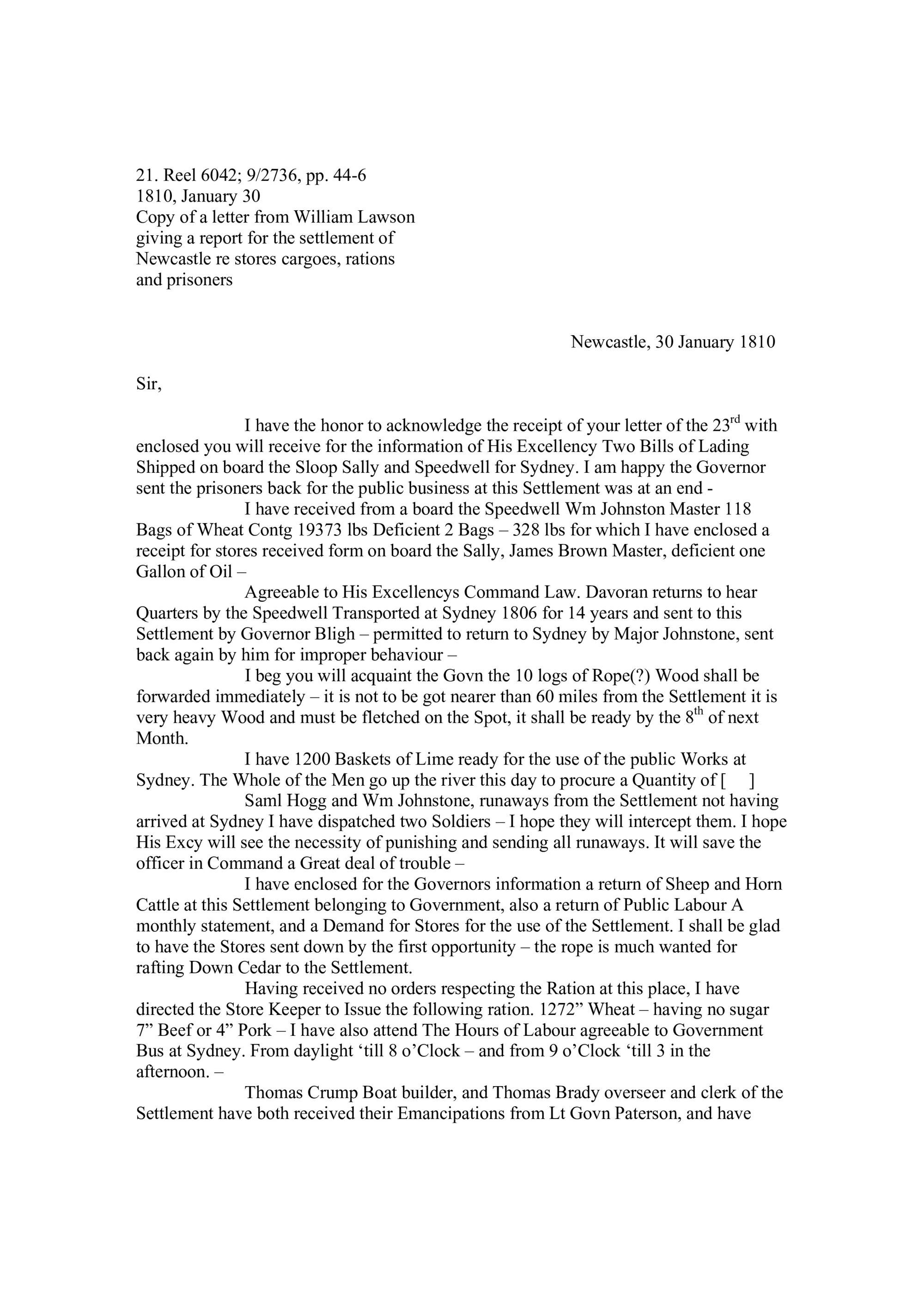 Di Gravio, Gionni (transcriber), Letter from William Lawson giving a report for the settlement of Newcastle, 1810 (30th January 1810), [1810jan30]. Living Histories, accessed 19/03/2026, https://livinghistories.newcastle.edu.au/nodes/view/56251