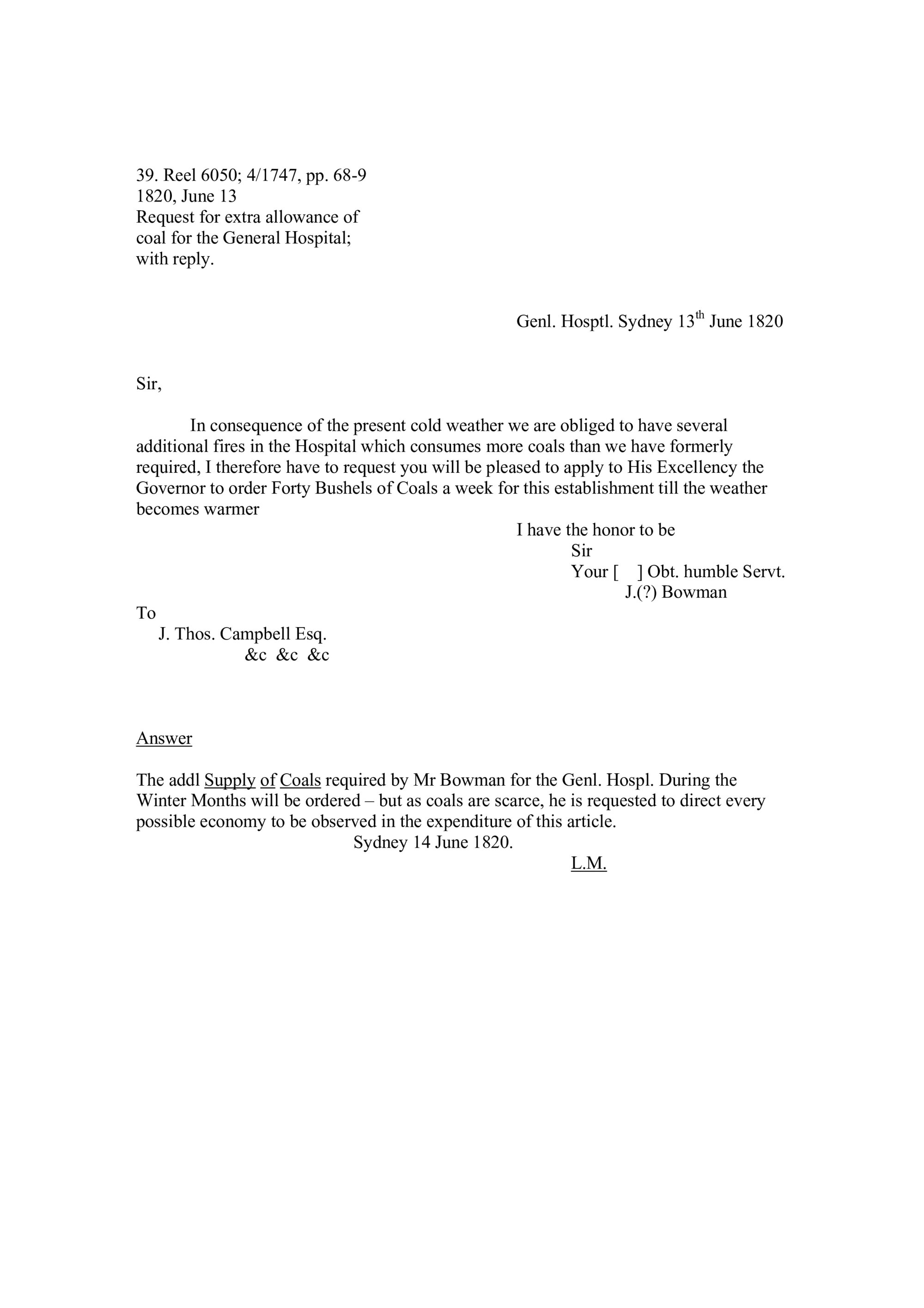 Request for extra allowance of coal for the General Hospital; with reply. 13 June 1820.