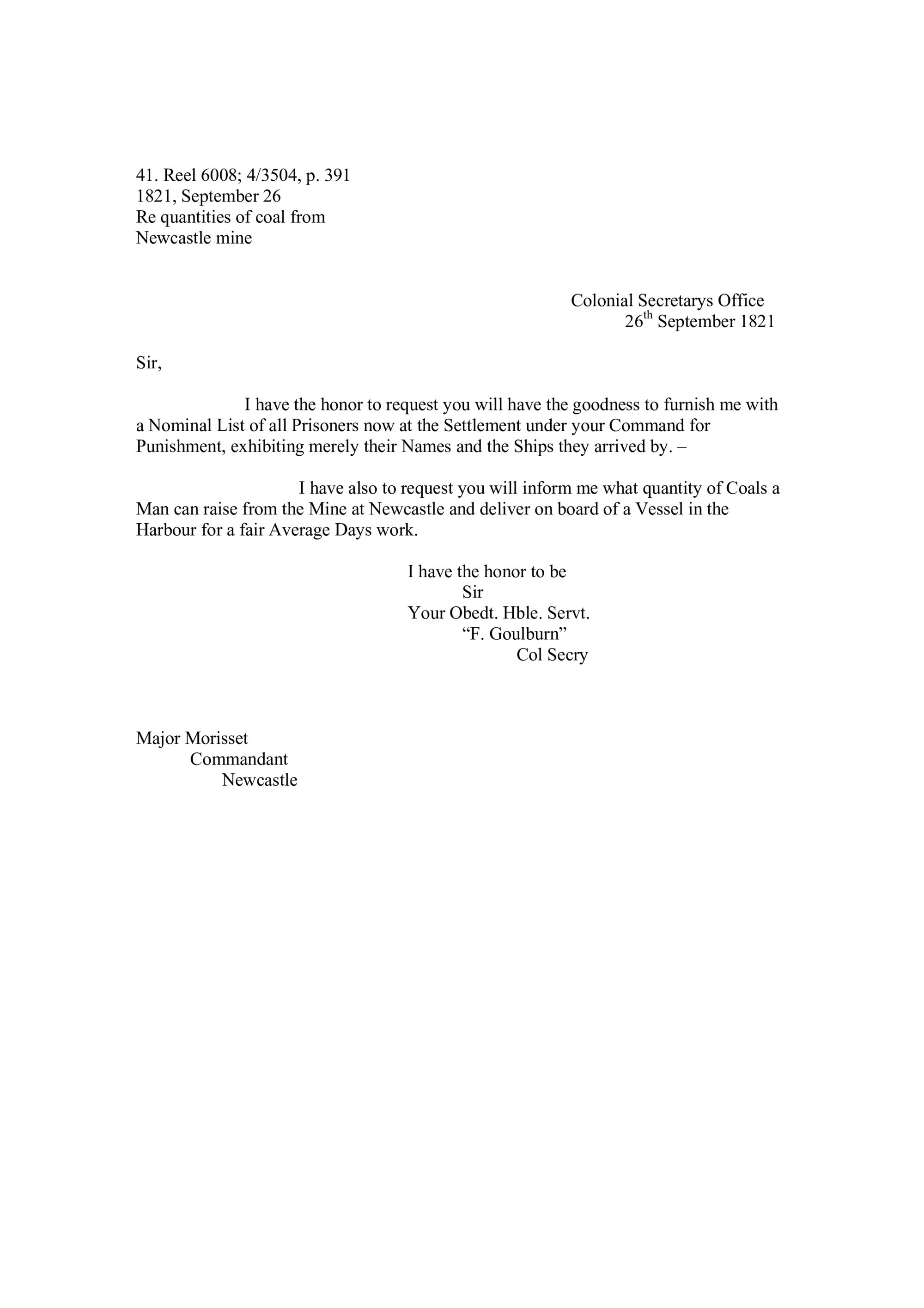 Di Gravio, Gionni (transcriber), Re quantities of coal from Newcastle mine. - 26 September 1821. (26 September 1821). Living Histories, accessed 03/04/2026, https://livinghistories.newcastle.edu.au/nodes/view/56280
