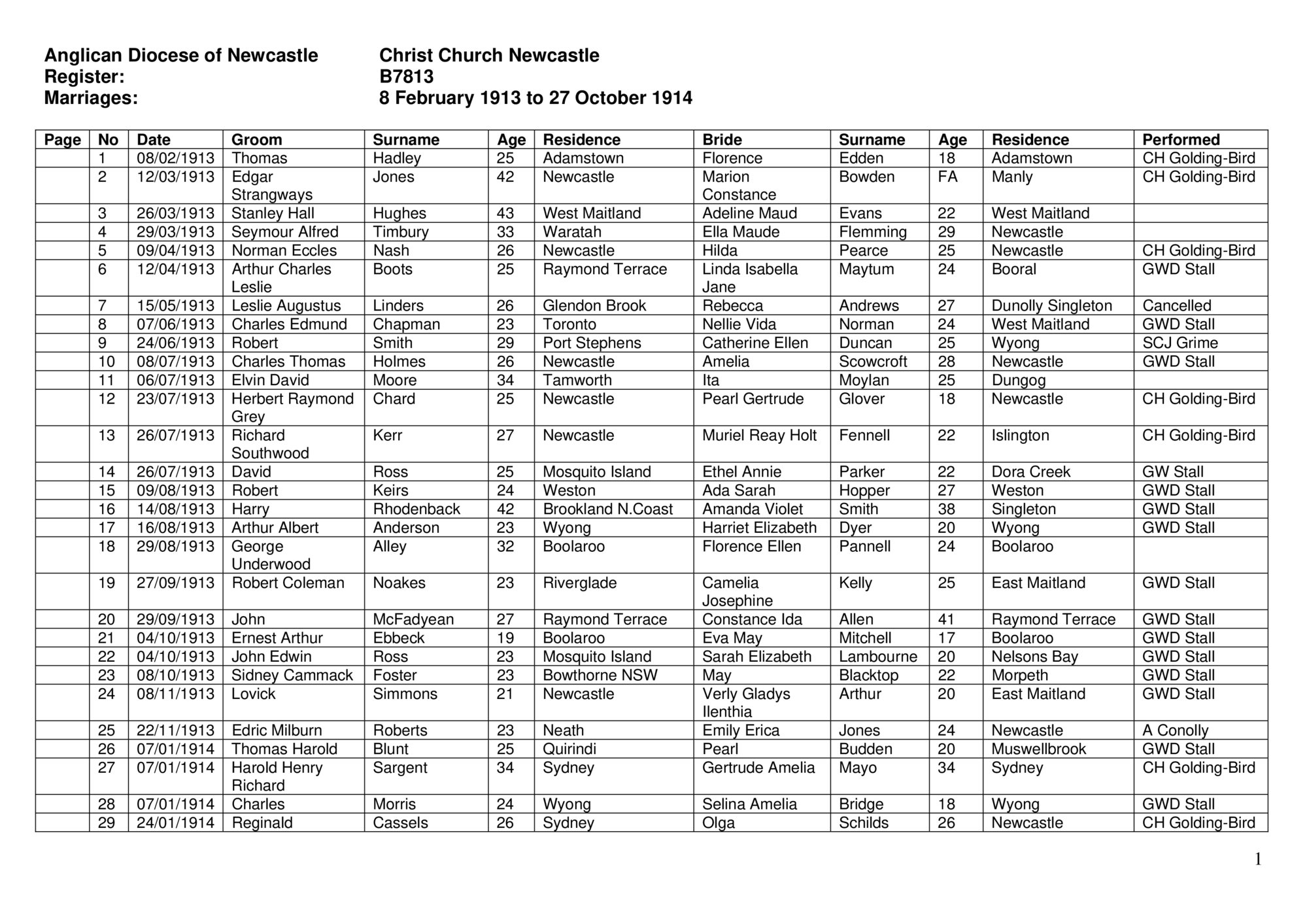 Anglican Church of Australia. Diocese of Newcastle, Transcription : Christ Church Cathedral Marriage Register, 1913-1914 (Between 8th February 1913 and 27th October 1914), [B7813]. Living Histories, accessed 15/04/2026, https://livinghistories.newcastle.edu.au/nodes/view/56346
