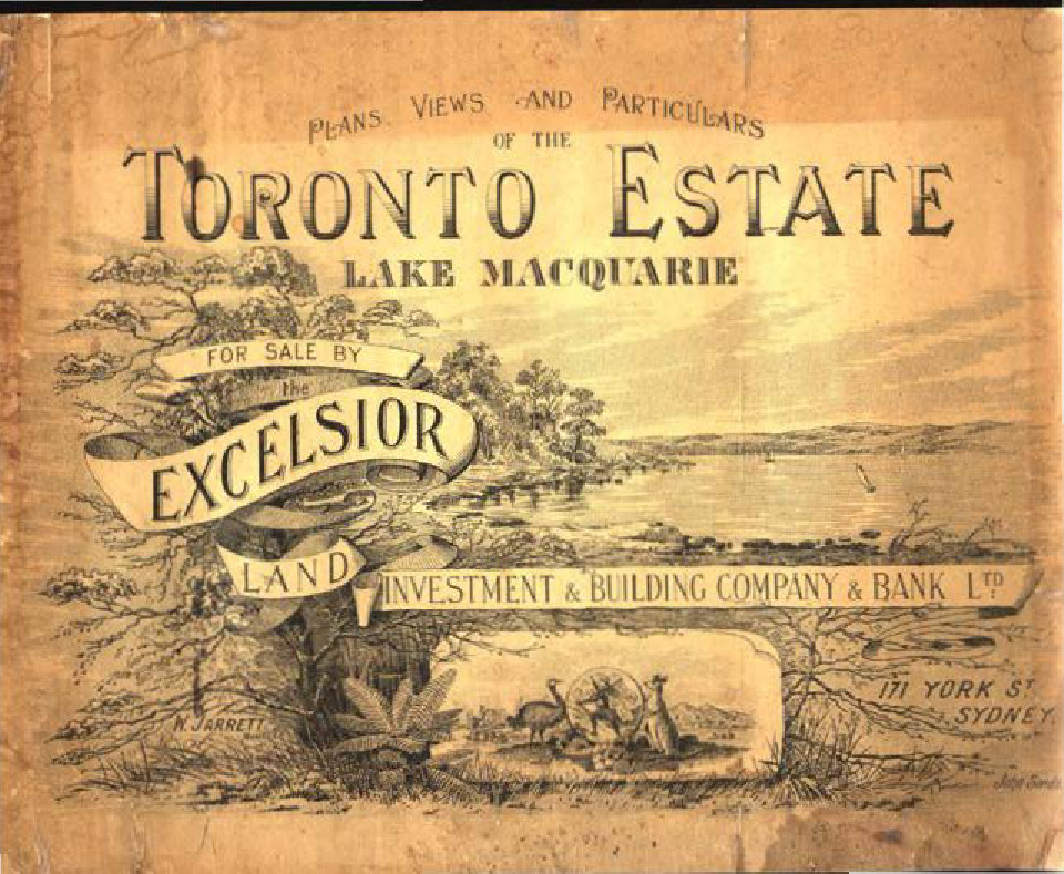 Excelsior Land Investment and Building Company and Bank, Plans, views and particulars of the Toronto Estate, Lake Macquarie, for sale by Excelsior ... ([1887]), [Q333.3099442 PLAN ]. Living Histories, accessed 17/04/2026, https://livinghistories.newcastle.edu.au/nodes/view/56540