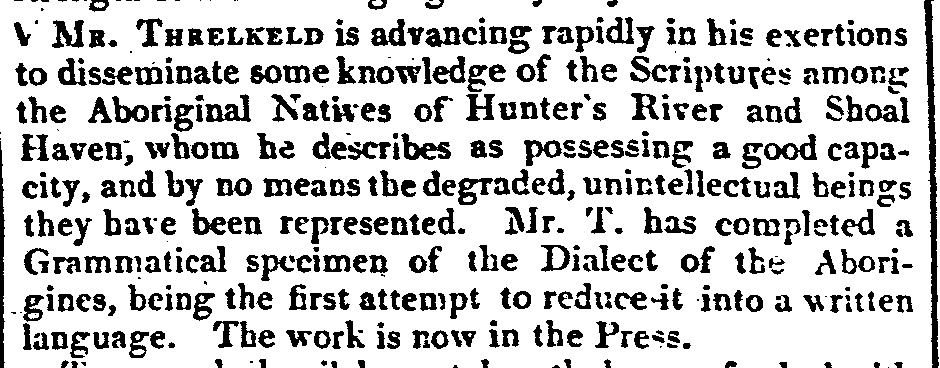 Article dated 30th March 1827 from The Monitor regarding Threlkeld's work at Hunter's River