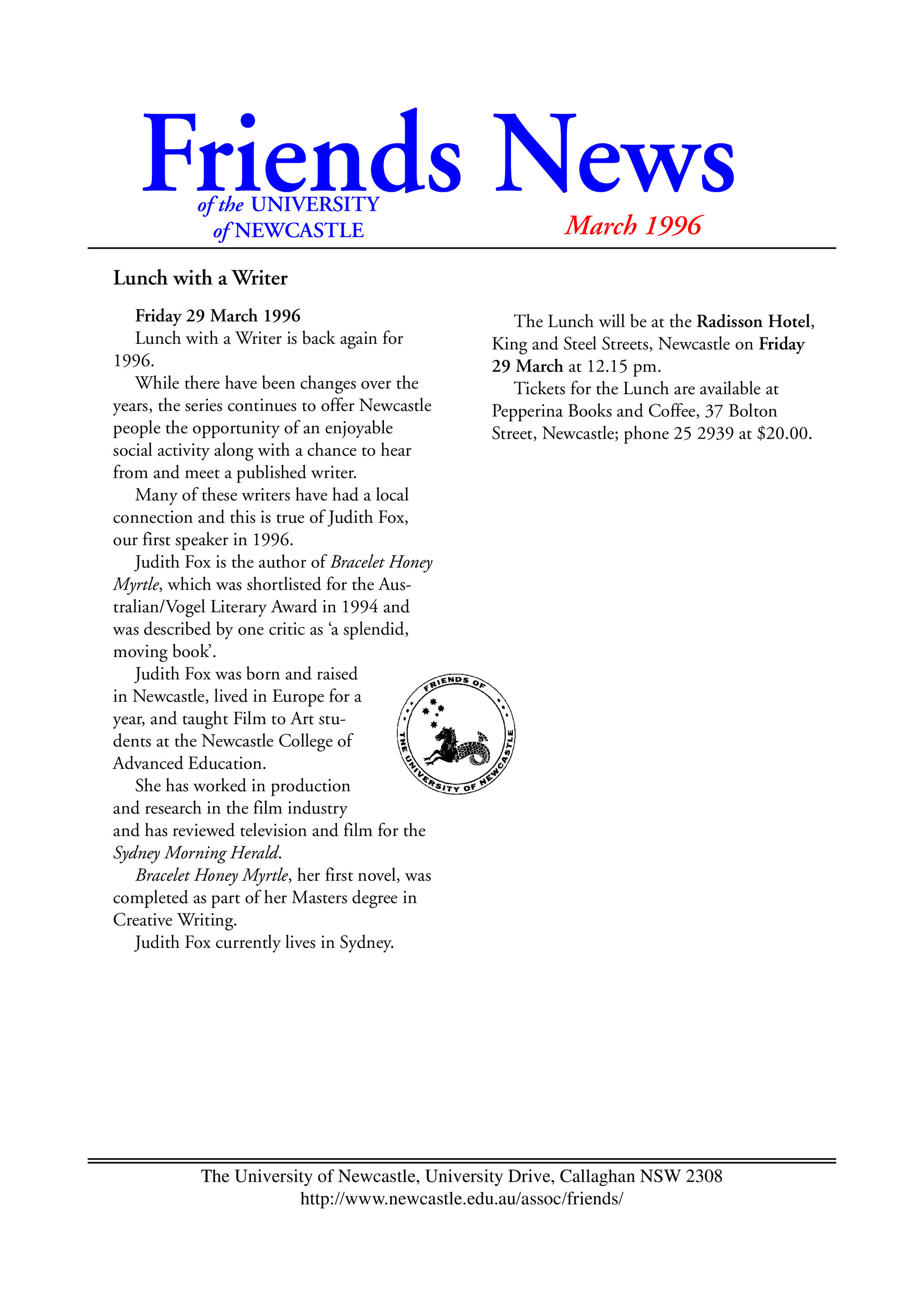 Lambert, John A. , Friends of the University of Newcastle News, March 1996 (1996-03), [news199603]. Living Histories, accessed 23/01/2026, https://livinghistories.newcastle.edu.au/nodes/view/57687
