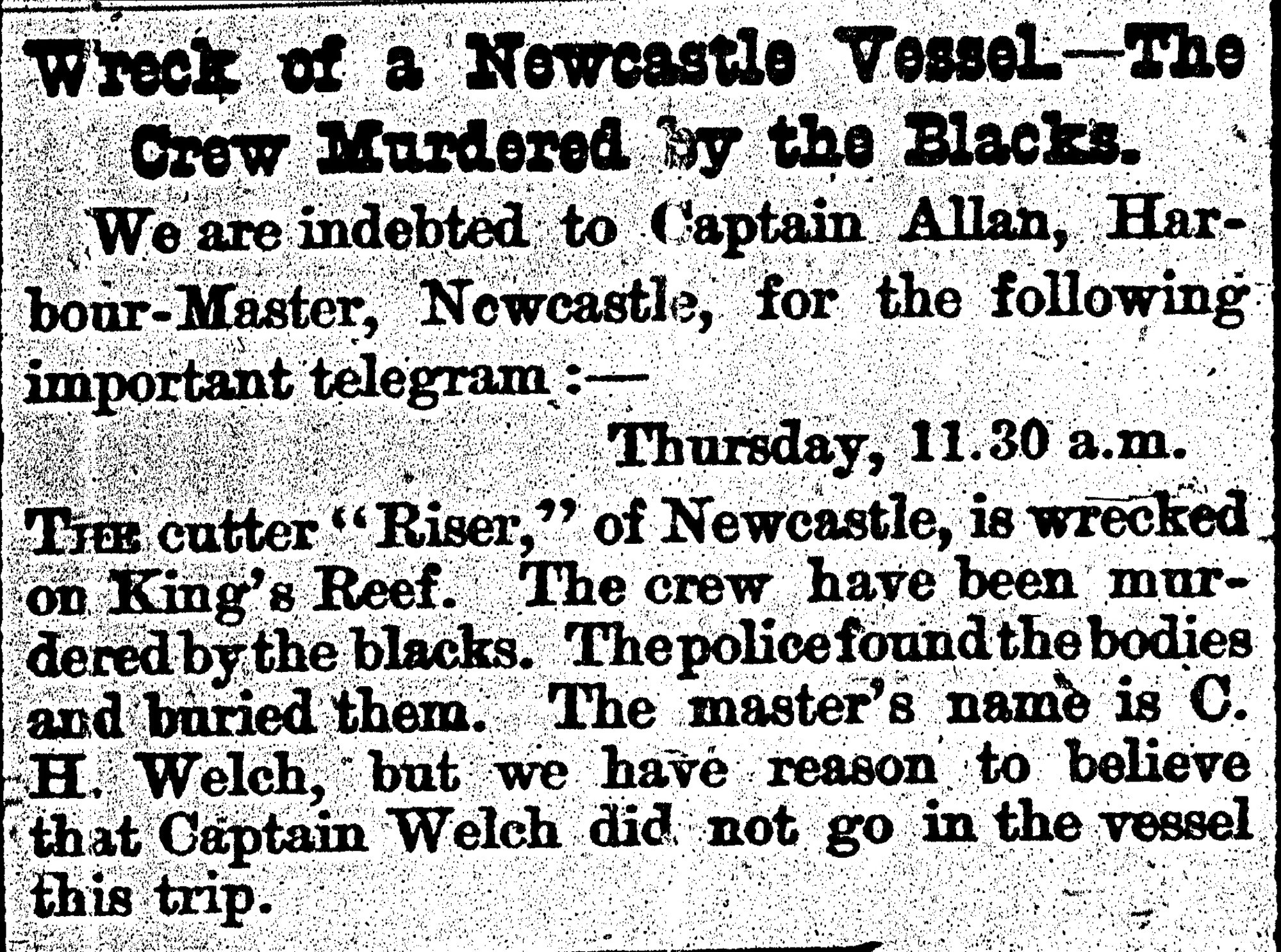 Newcastle Morning Herald and Miners' Advocate, "Wreck of a Newcastle Vessel - The Crew Murdered by the Blacks", Newcastle Morning Herald, 13 September 1878 , [nmhsept1878]. Living Histories, accessed 02/04/2026, https://livinghistories.newcastle.edu.au/nodes/view/57727
