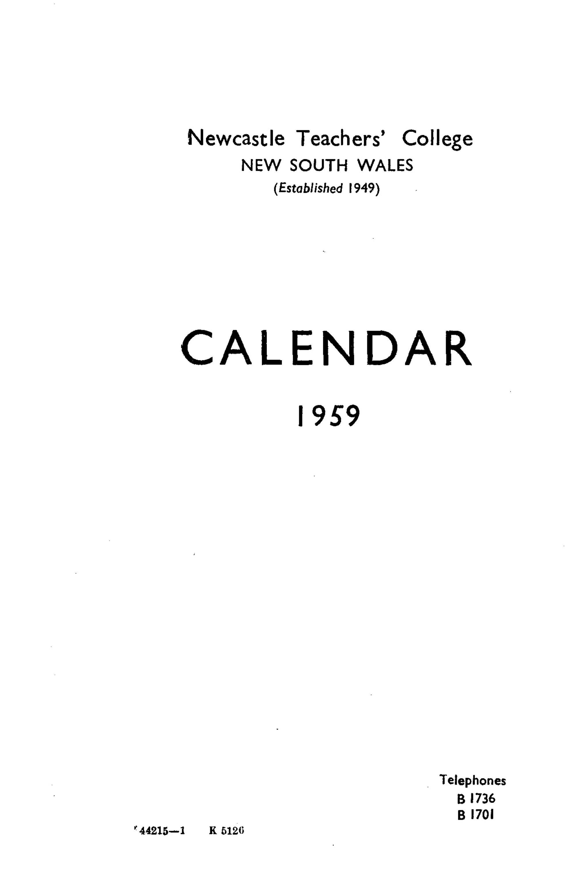 Newcastle Teachers' College, Newcastle Teachers' College Calendar, 1959 (1959). Living Histories, accessed 23/01/2026, https://livinghistories.newcastle.edu.au/nodes/view/57804
