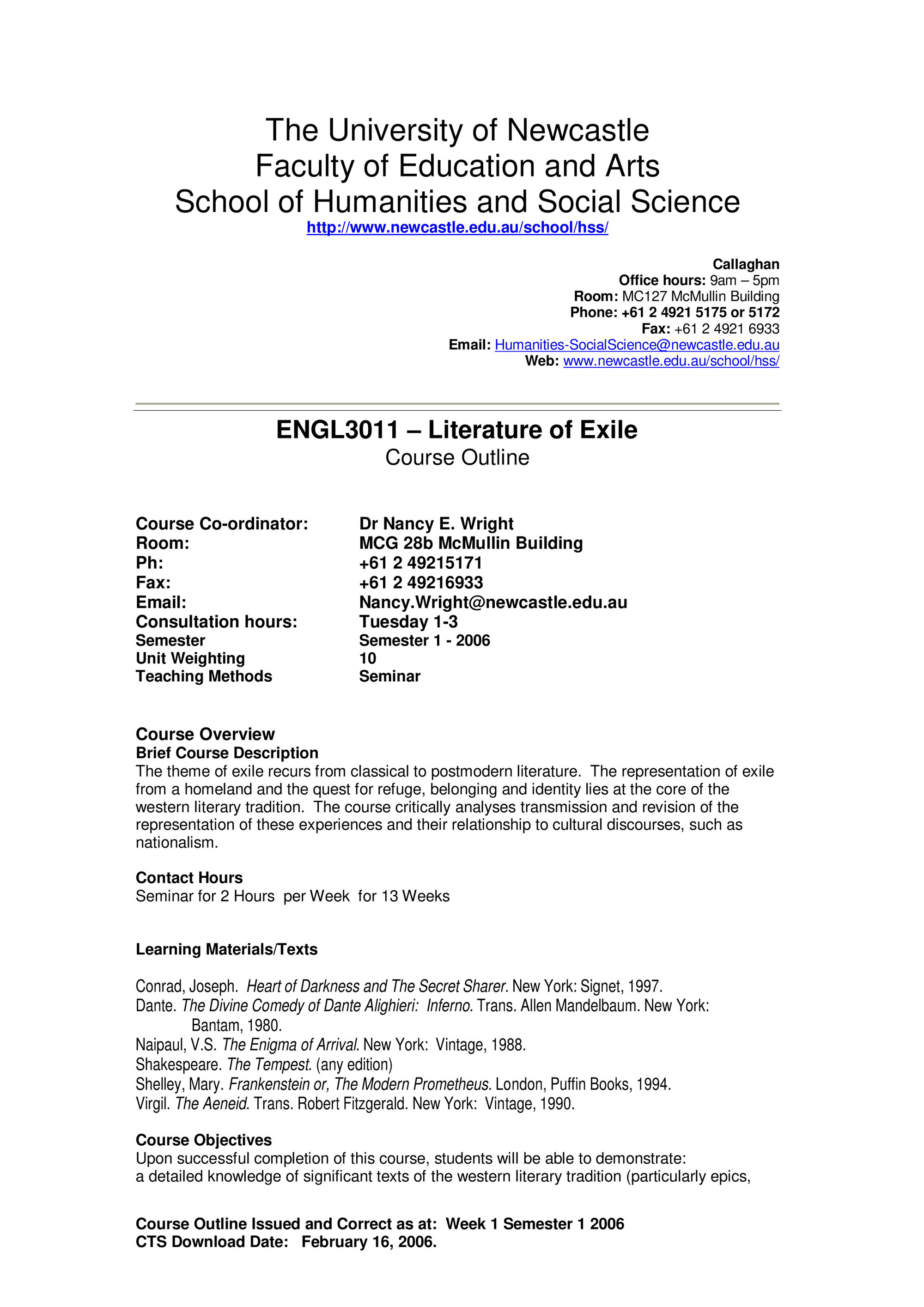 School of Humanities and Social Science, ENGL3011 Course Outline, Semester 1, 2006 (2006). Living Histories, accessed 20/01/2026, https://livinghistories.newcastle.edu.au/nodes/view/58120