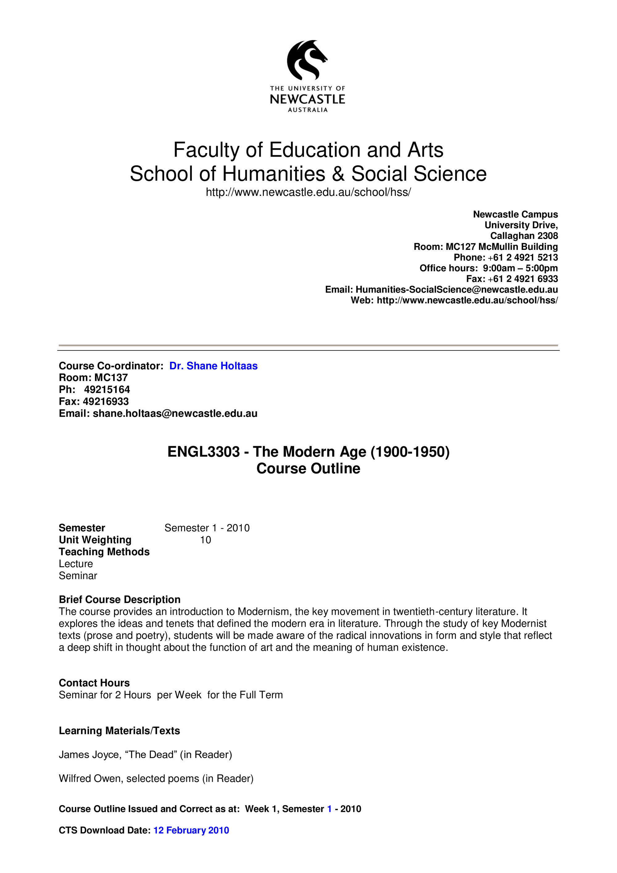 School of Humanities and Social Science, ENGL3303 Callaghan - Course Outline, Semester 1, 2010 (2010). Living Histories, accessed 19/03/2026, https://livinghistories.newcastle.edu.au/nodes/view/58145