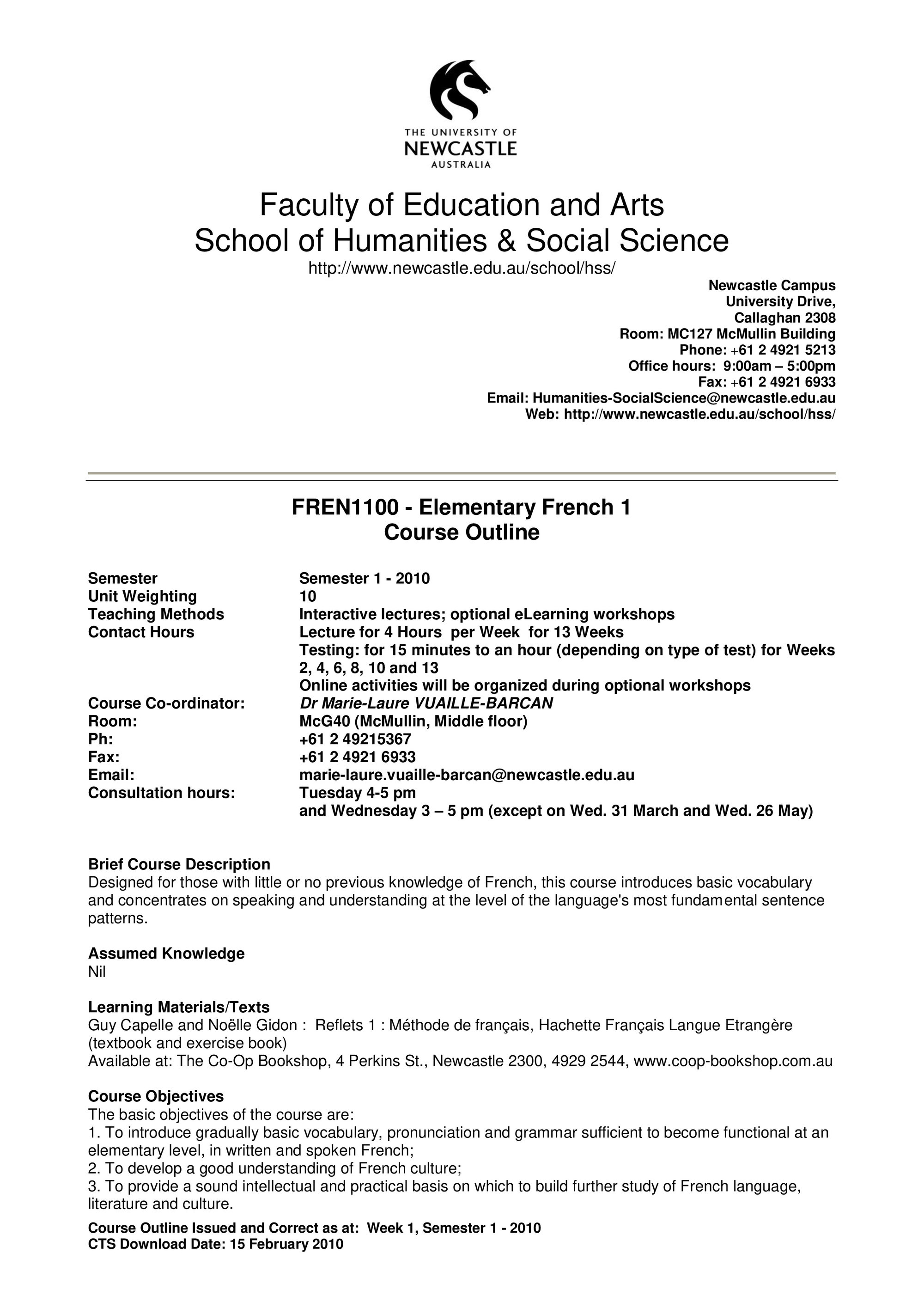 School of Humanities and Social Science, FREN1100 Course Outline, Semester 1, 2010 (2010). Living Histories, accessed 14/02/2026, https://livinghistories.newcastle.edu.au/nodes/view/58218