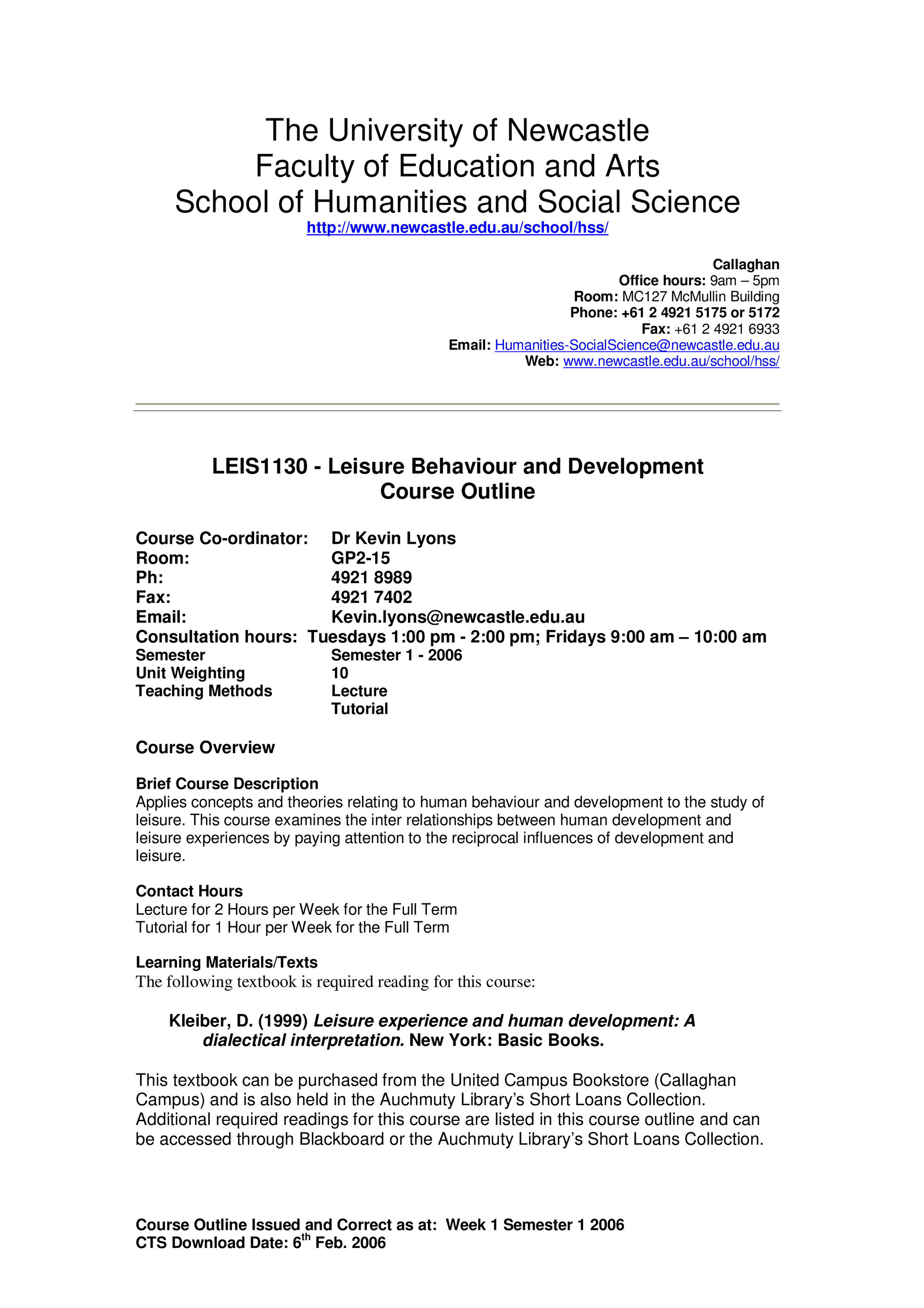 School of Humanities and Social Science, LEIS1130 Course Outline, Semester 1, 2006 (2006). Living Histories, accessed 15/04/2026, https://livinghistories.newcastle.edu.au/nodes/view/58403