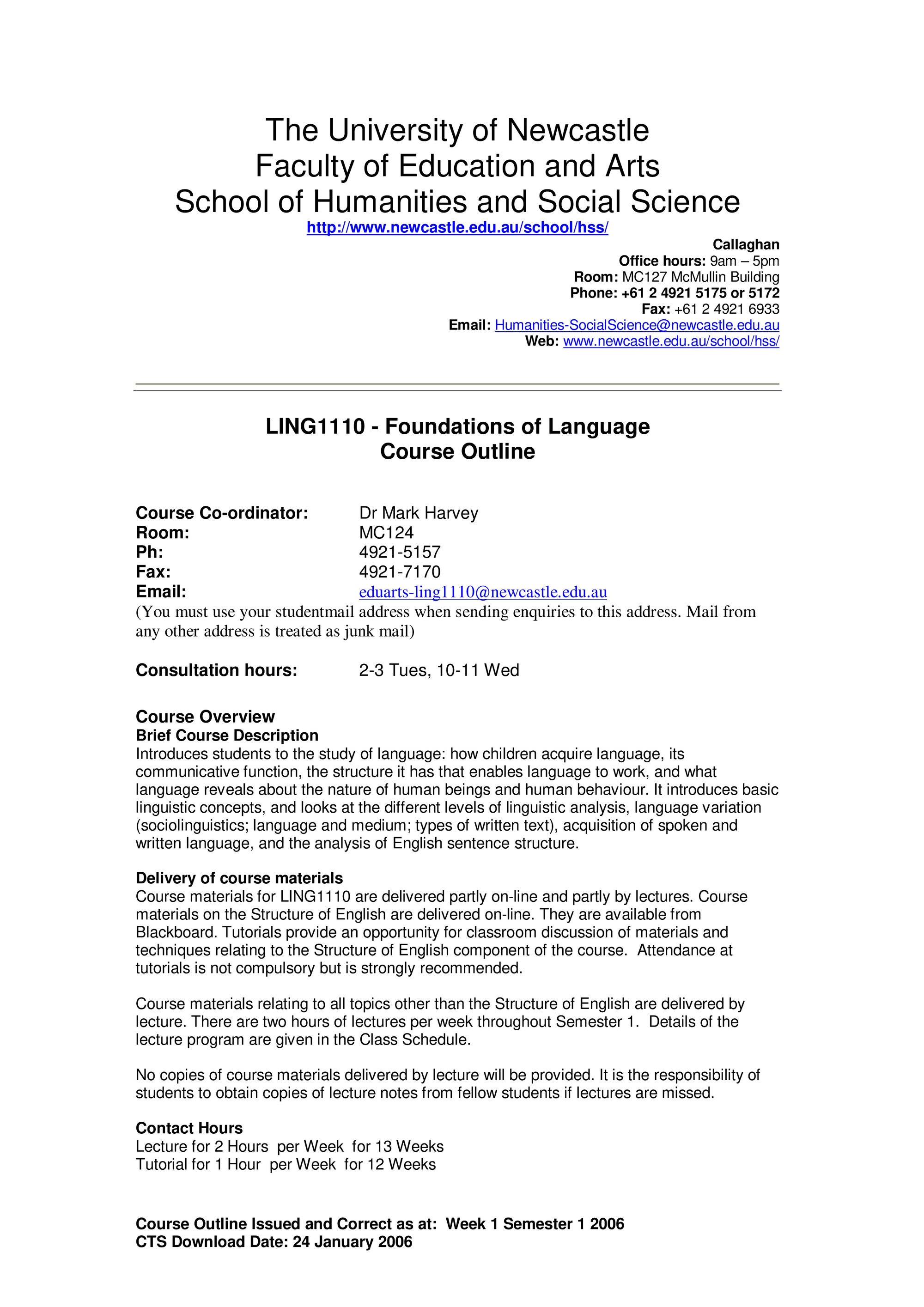 School of Humanities and Social Science, LING1110 Course Outline, Semester 2, 2006 (2006). Living Histories, accessed 15/01/2026, https://livinghistories.newcastle.edu.au/nodes/view/58424