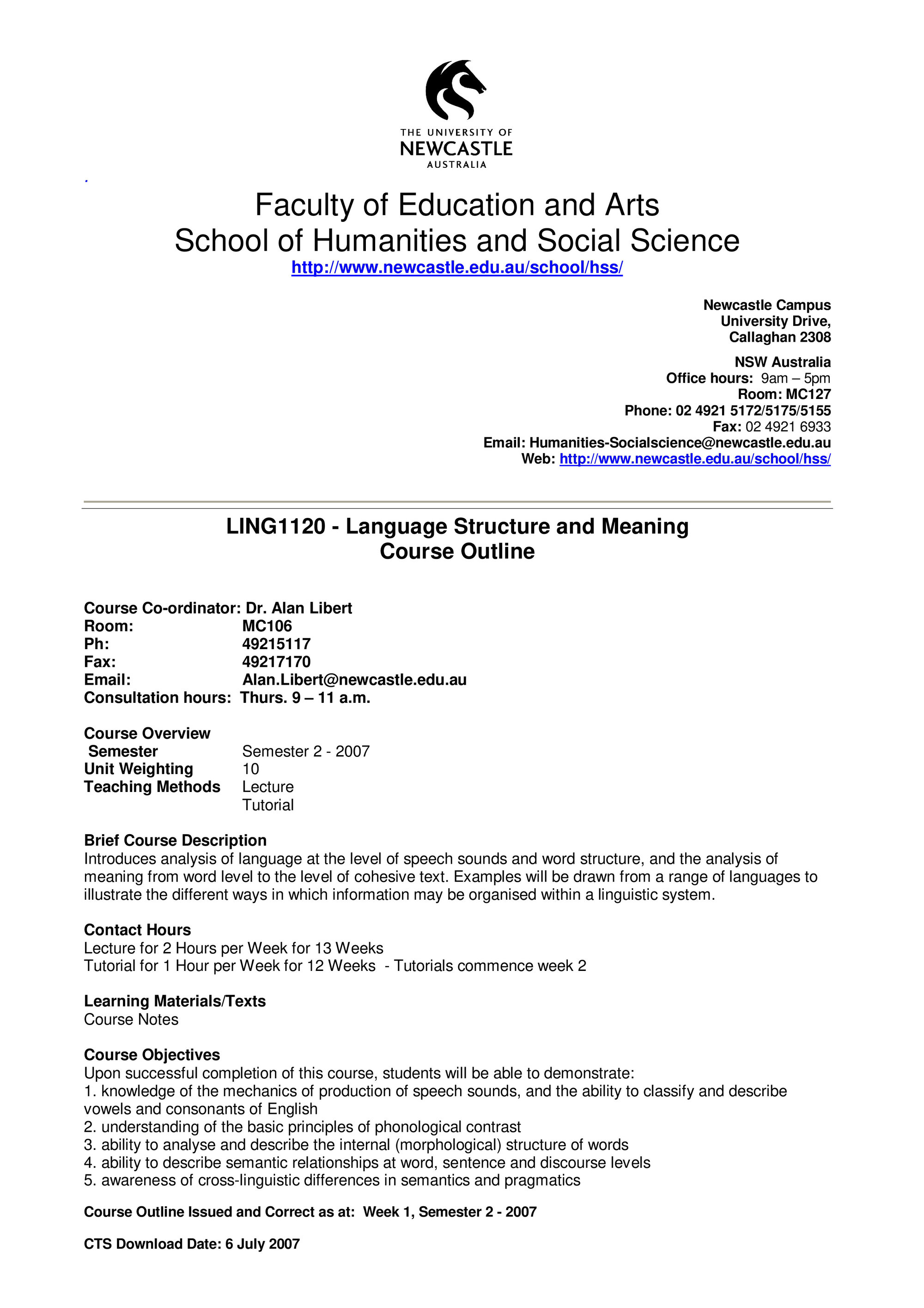 School of Humanities and Social Science, LING1120 Course Outline, Semester 2, 2007 (2007). Living Histories, accessed 12/03/2026, https://livinghistories.newcastle.edu.au/nodes/view/58439