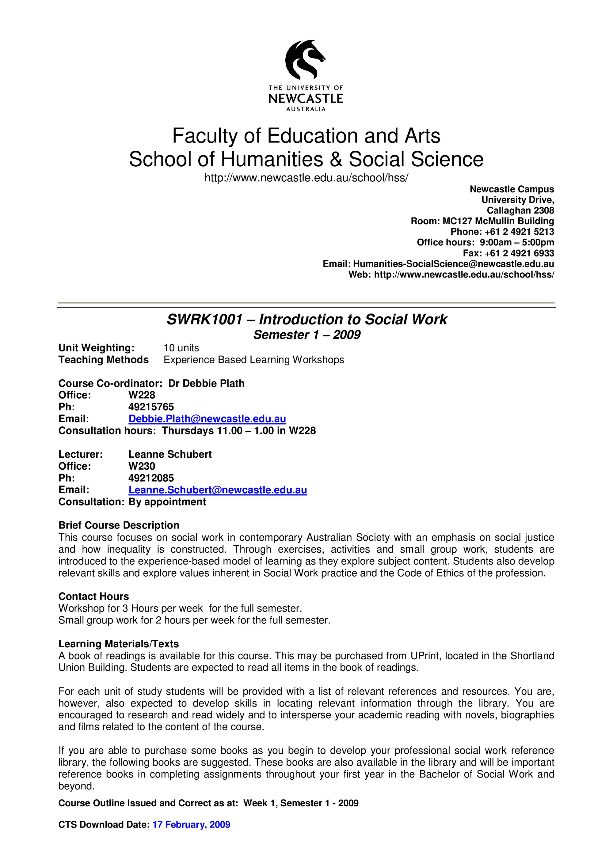 School of Humanities and Social Science, SWRK1001 Course Outline, Semester 1, 2009 (2009). Living Histories, accessed 15/04/2026, https://livinghistories.newcastle.edu.au/nodes/view/58867