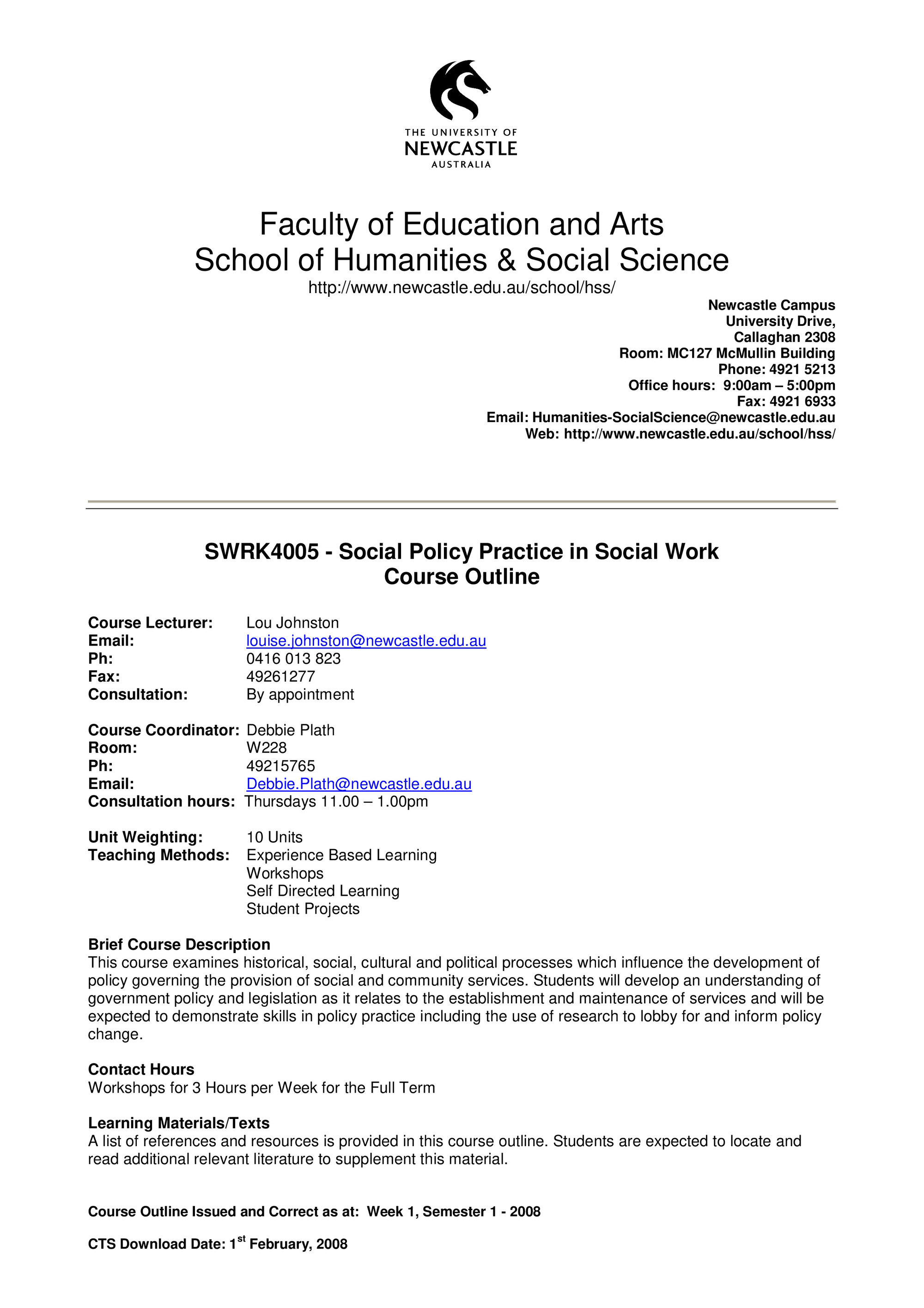 School of Humanities and Social Science, SWRK4005 Course Outline, Semester 1, 2008 (2008). Living Histories, accessed 16/04/2026, https://livinghistories.newcastle.edu.au/nodes/view/58912