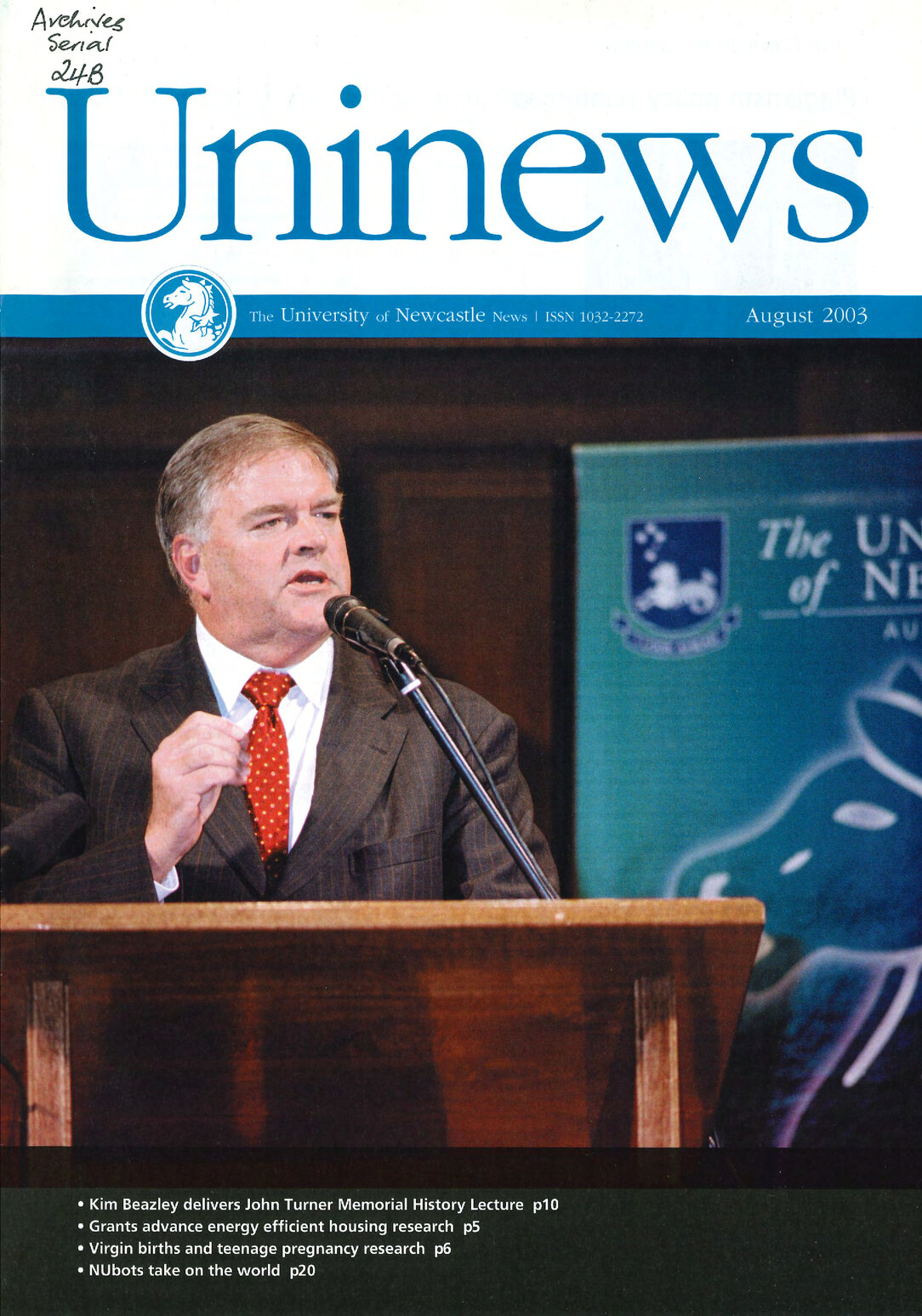 University of Newcastle (N.S.W.), UniNews (University of Newcastle, N.S.W.), August, 2003, [Archives Serial 24]. Living Histories, accessed 03/04/2026, https://livinghistories.newcastle.edu.au/nodes/view/59288