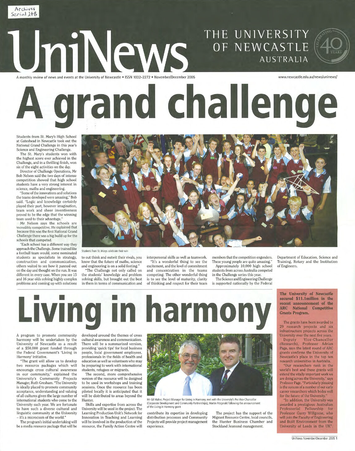 University of Newcastle (N.S.W.), UniNews (University of Newcastle, N.S.W.), November/December, 2005, [Archives Serial 24]. Living Histories, accessed 04/04/2026, https://livinghistories.newcastle.edu.au/nodes/view/59293