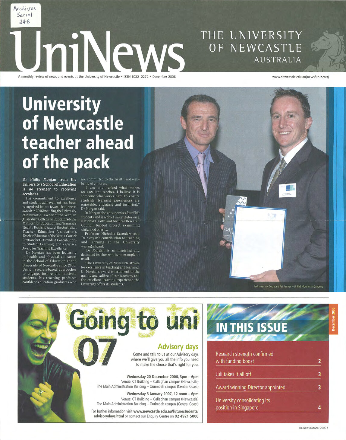 University of Newcastle (N.S.W.), UniNews (University of Newcastle, N.S.W.), December, 2006, [Archives Serial 24]. Living Histories, accessed 04/04/2026, https://livinghistories.newcastle.edu.au/nodes/view/59298