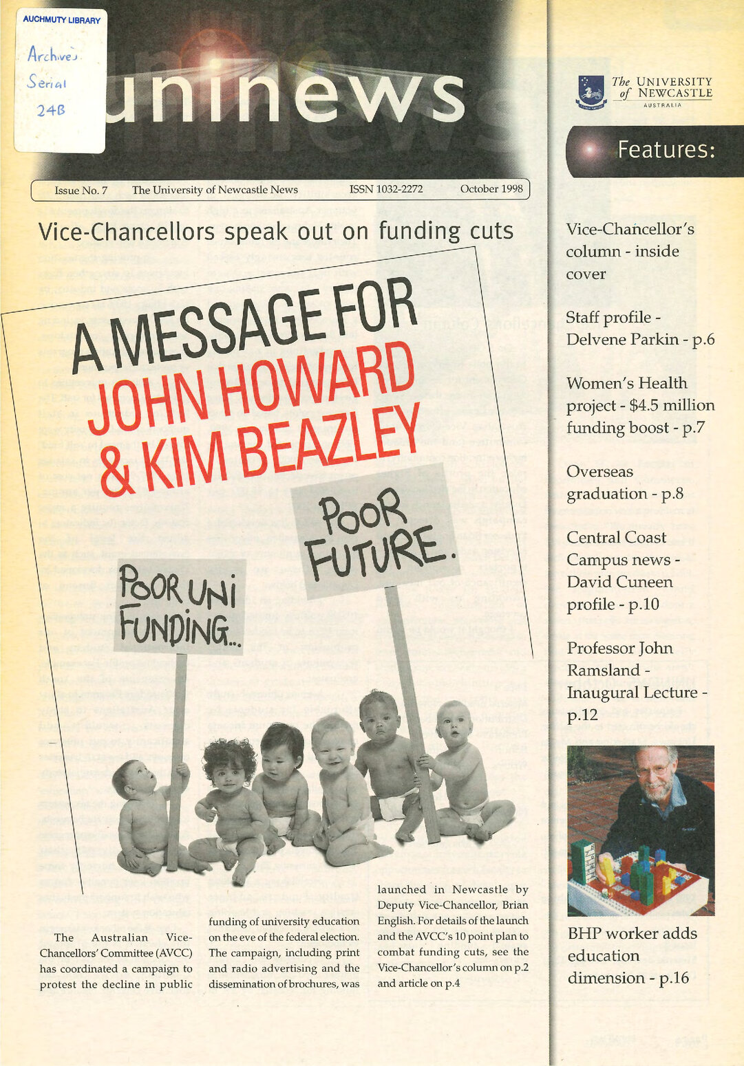 University of Newcastle (N.S.W.), UniNews (University of Newcastle, N.S.W.), Issue No. 7, October, 1998, [Archives Serial 24]. Living Histories, accessed 04/04/2026, https://livinghistories.newcastle.edu.au/nodes/view/59317