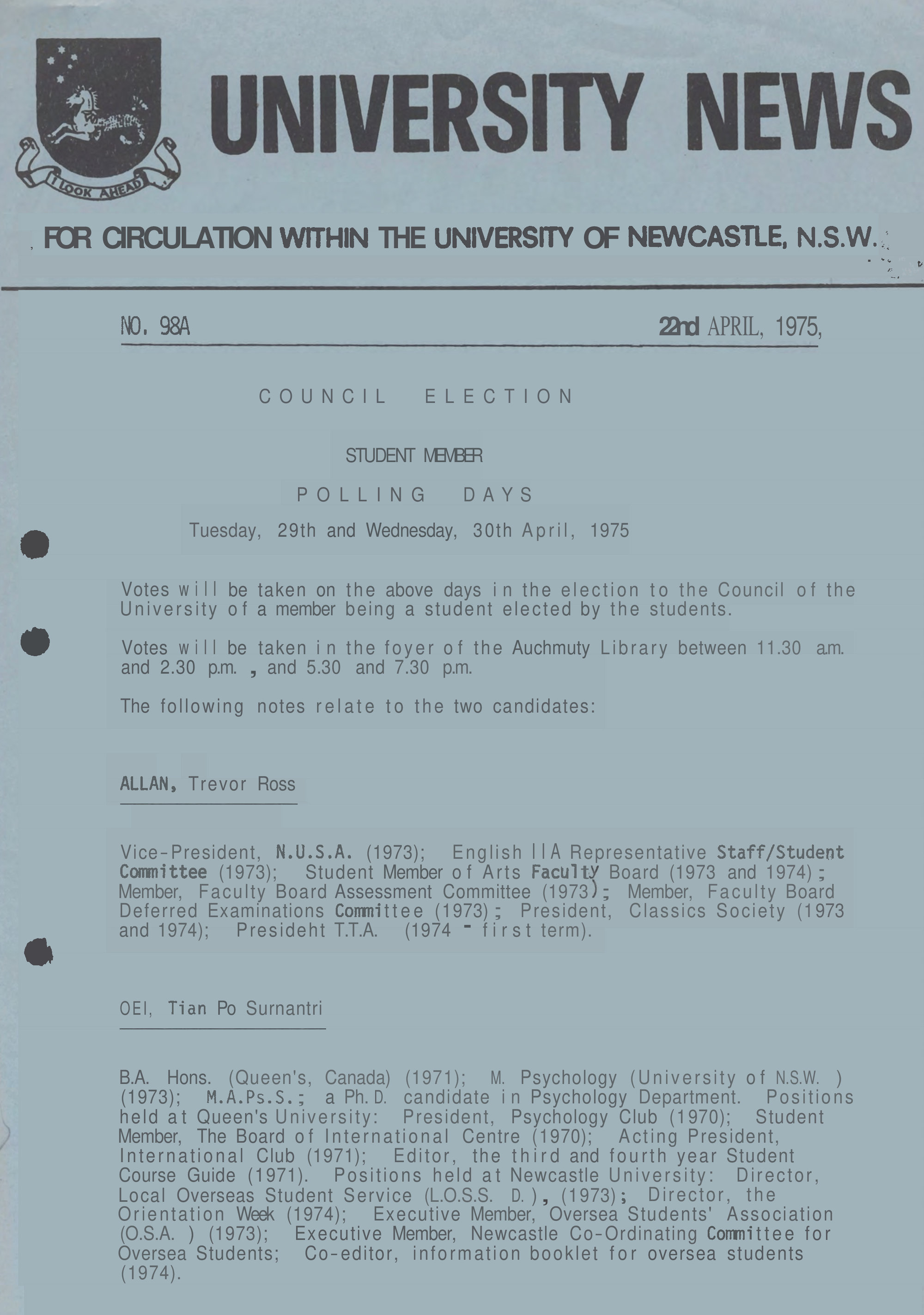 University of Newcastle (N.S.W.), University News No. 98A - 22 April 1975, [Archives Serial 24]. Living Histories, accessed 11/02/2026, https://livinghistories.newcastle.edu.au/nodes/view/59473