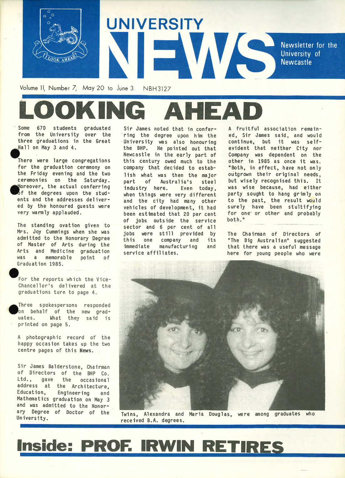 University of Newcastle (N.S.W.), The University News, Vol. 11, No. 7, May 20 - June 3, 1985, [Archives Serial 24]. Living Histories, accessed 30/04/2026, https://livinghistories.newcastle.edu.au/nodes/view/59662