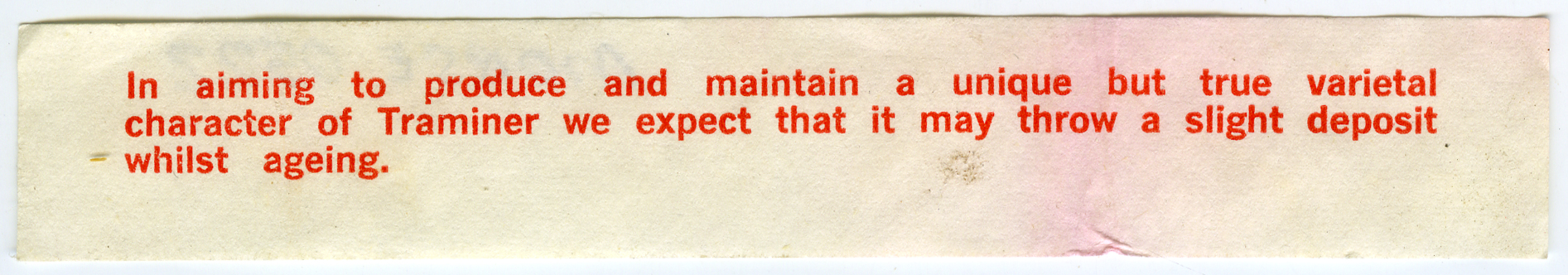 Label reads "In aiming to produce and maintain a unique but true varietal character of Traminer we expect that it may throw a slight deposit whilst aging".
