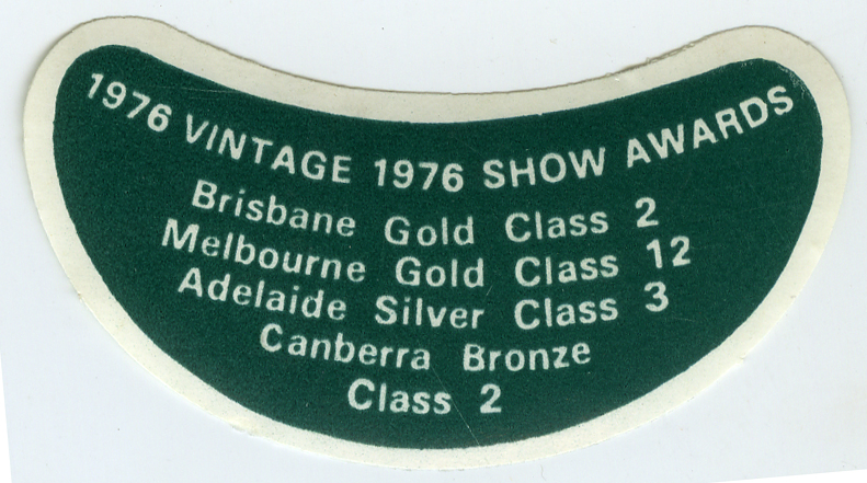 Date1976CollectorMorse, AllanDescriptionLabel reads "1976 vintage 1976 show awards - Brisbane gold class 2 - Melbourne gold class 12 - Adelaide silver class 3 - Canberra bronze class 2".