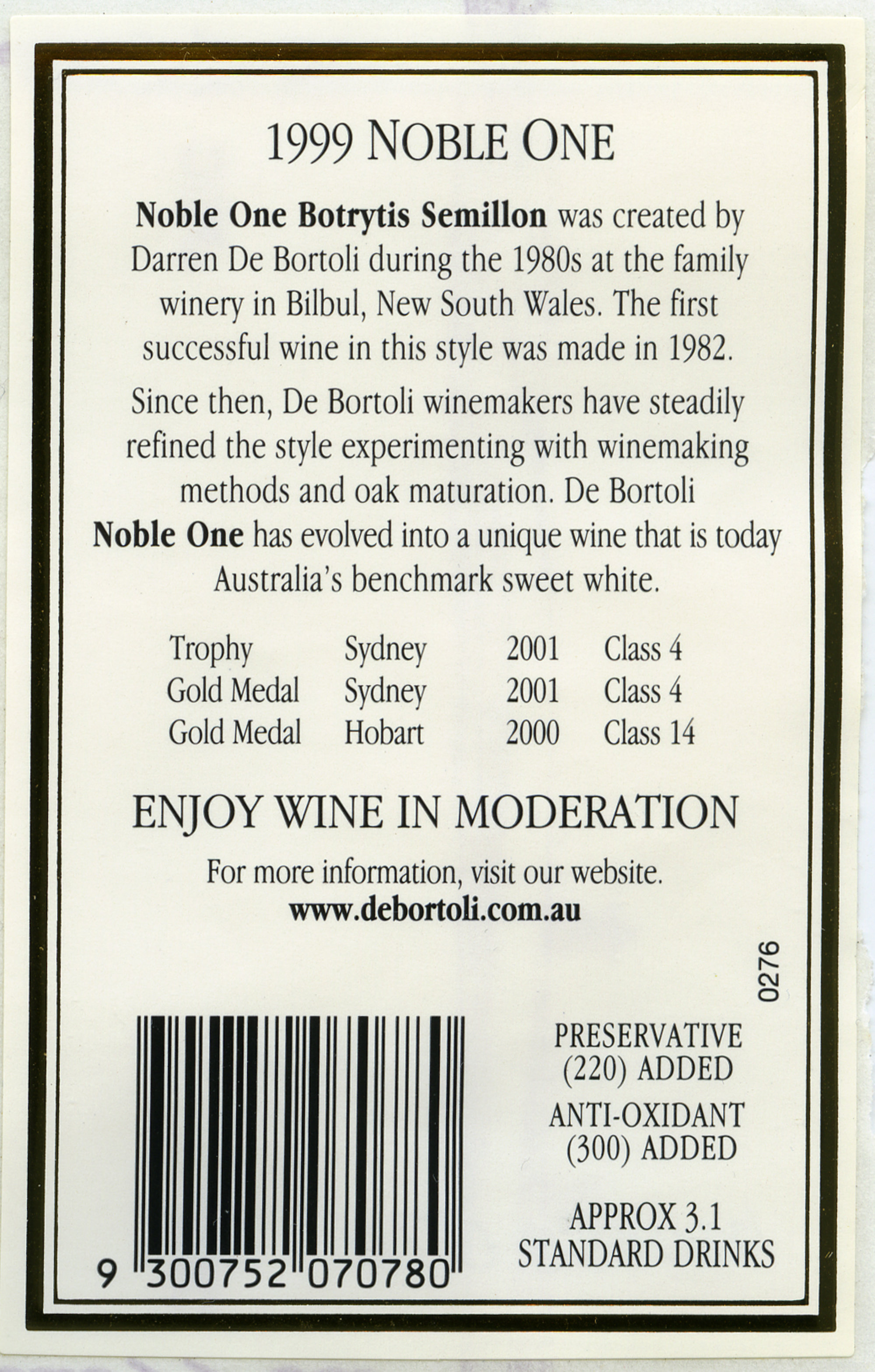 Nobel One back label for a bottle of Botrytis Semillon (1999)