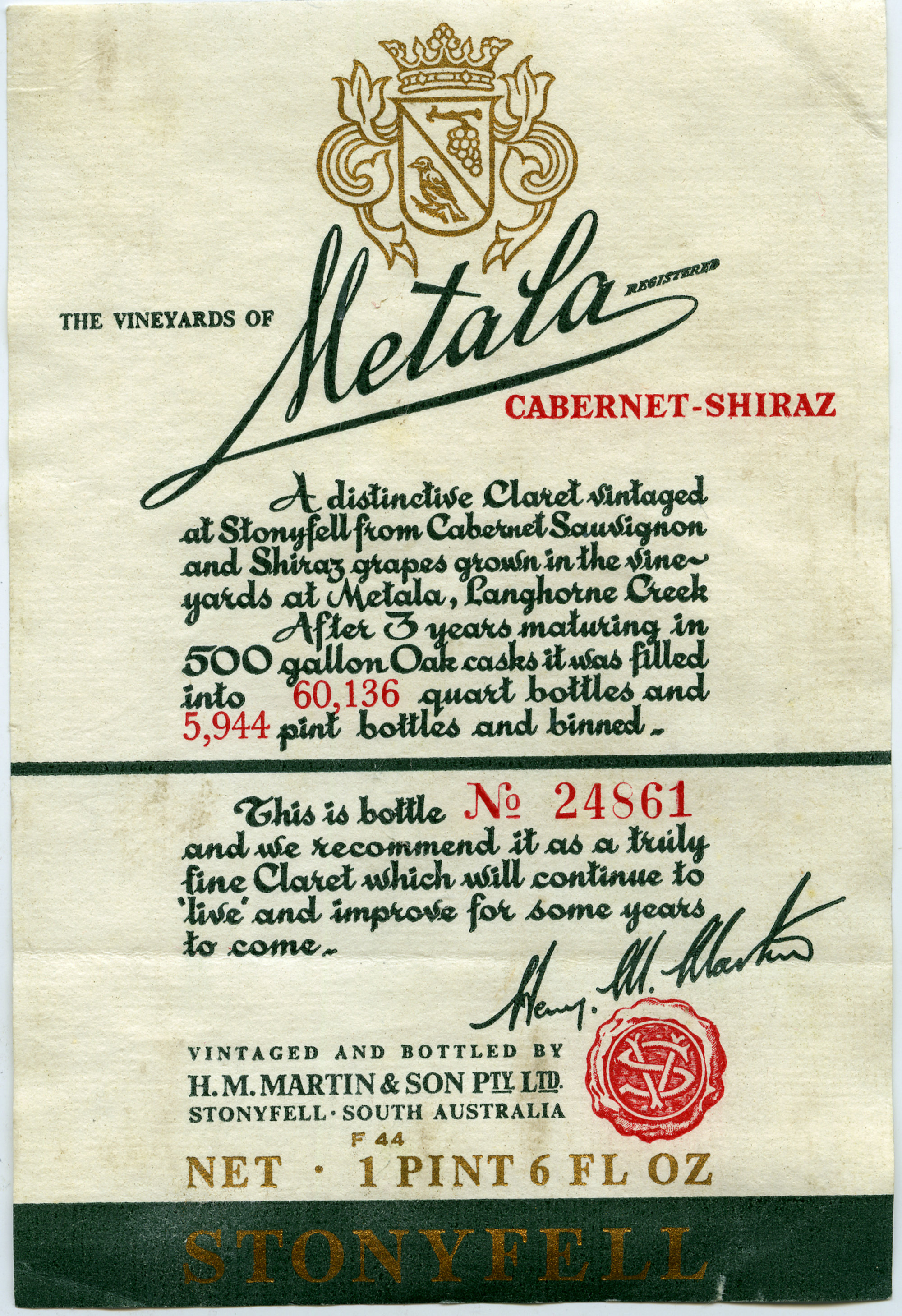 Label reads: "The Vineyards of Metala. Cabernet-Shiraz. A distinctive Claret vintaged at Stonyfell from Cabernet Sauvignon and Shiraz grapes grown in the vineyards at Metala, Langhorne Creek. After 3 years maturation in 500 gallon Oak casks it was filled into 60,136 quart bottled and 5,944 pint bottled and binned. This is bottle No. 24861 and we recommend it as a truly fine Claret which will continue to 'live' and improve for some years to come. Vintaged and bottled by H. M. Martin and Sons pty. Ltd. Stonyfell, South Australia. F44. Net 1 pint 6 fl. oz. Stonyfell."