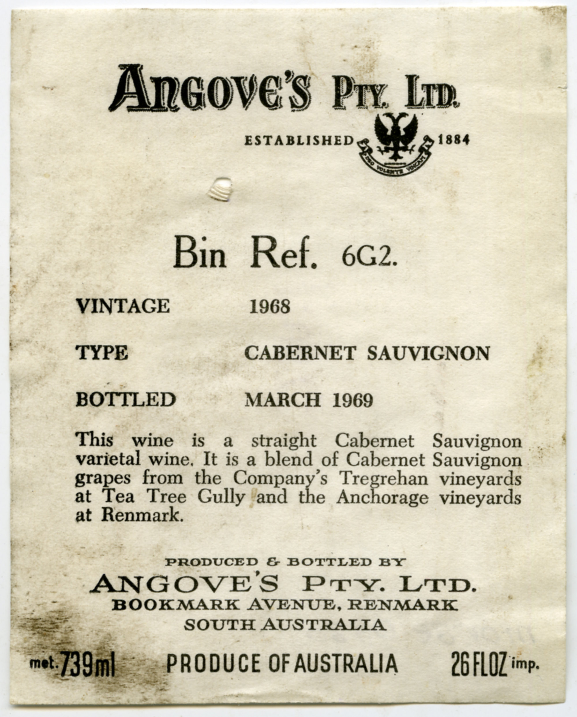 Angove's label for a bottle of Cabernet Sauvignon (1969) (1969). Living Histories, accessed 13/03/2026, https://livinghistories.newcastle.edu.au/nodes/view/60996