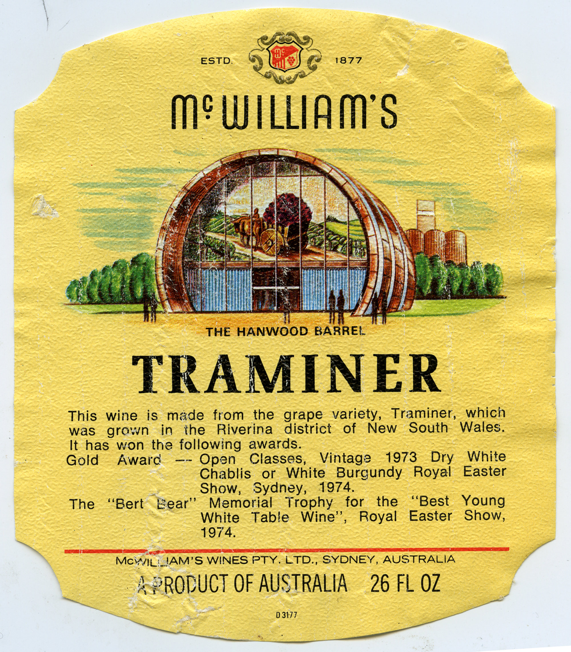 Label reads: "Estd. 1877. McWilliam's The Hanwood Barrel Traminer. This wine is made from the grape variety, Traminer, which was grown in the Riverina district of New South Wales. It has won the following awards. Gold Award - Open Classes, Vintage 1973 Dry White Chablis or White Burgundy Royal Easter Show, Sydney, 1974. The "Bert Bear"Memorial Trophy for the "Best Young White Table Wine", Royal Easter Show, 1974. McWilliam's Wines Pty. Ltd., Sydney, Australia. A product of Australia. 26 fl oz. D3177."