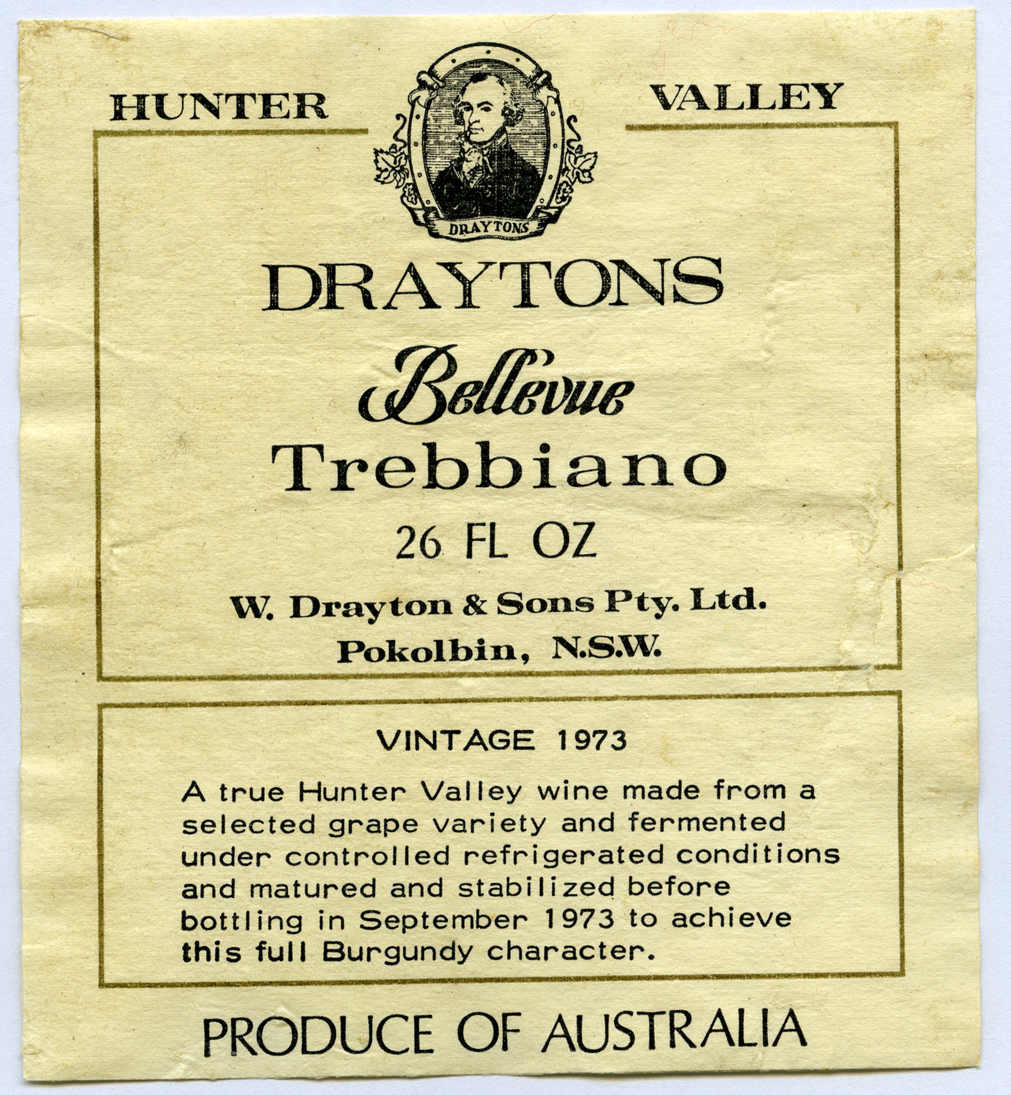 Label reads: "Hunter Valley. Draytons Bellevue Trebbiano 26 fl oz. W. Drayton & Sons Pty. Ltd. Pokolbin, N.S.W..."