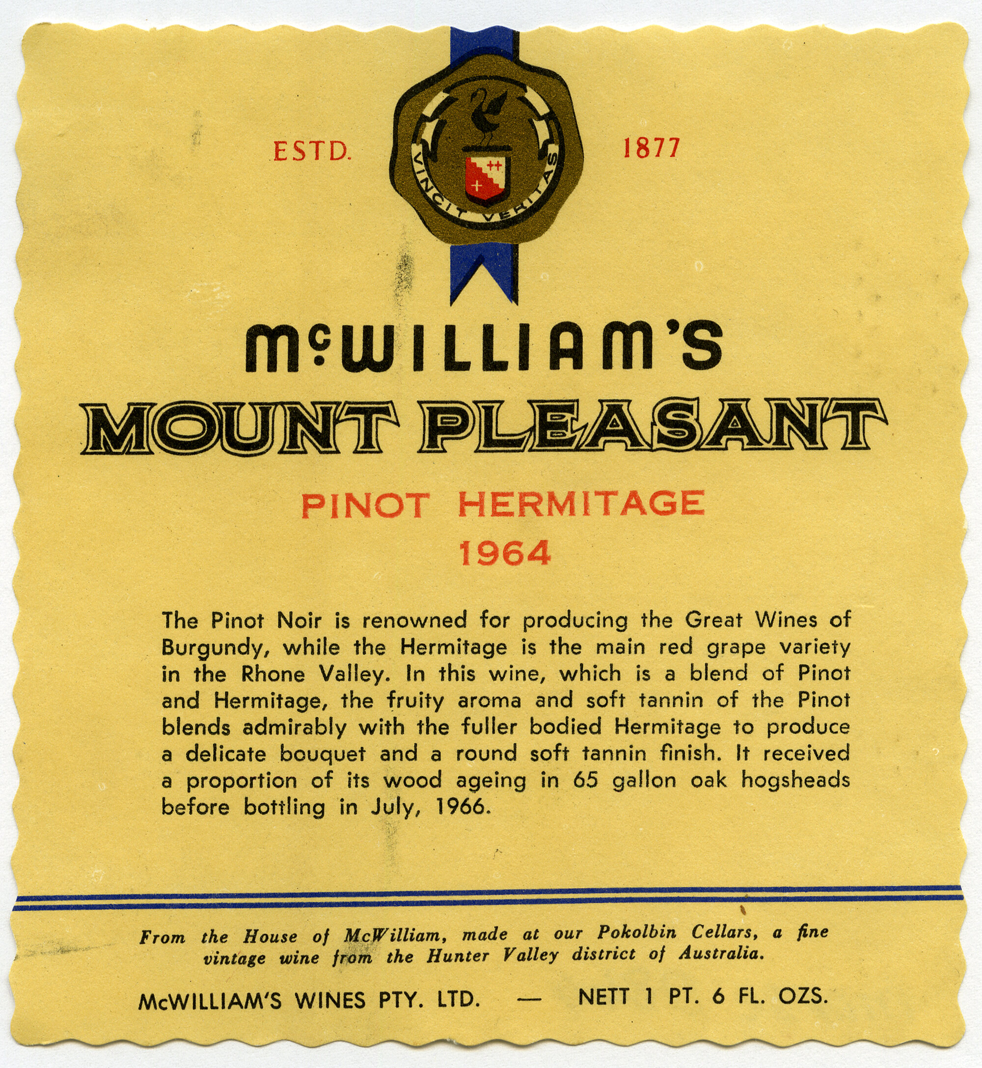 McWilliam's Mount Pleasant Label (1964) (1964). Living Histories, accessed 17/04/2026, https://livinghistories.newcastle.edu.au/nodes/view/61106