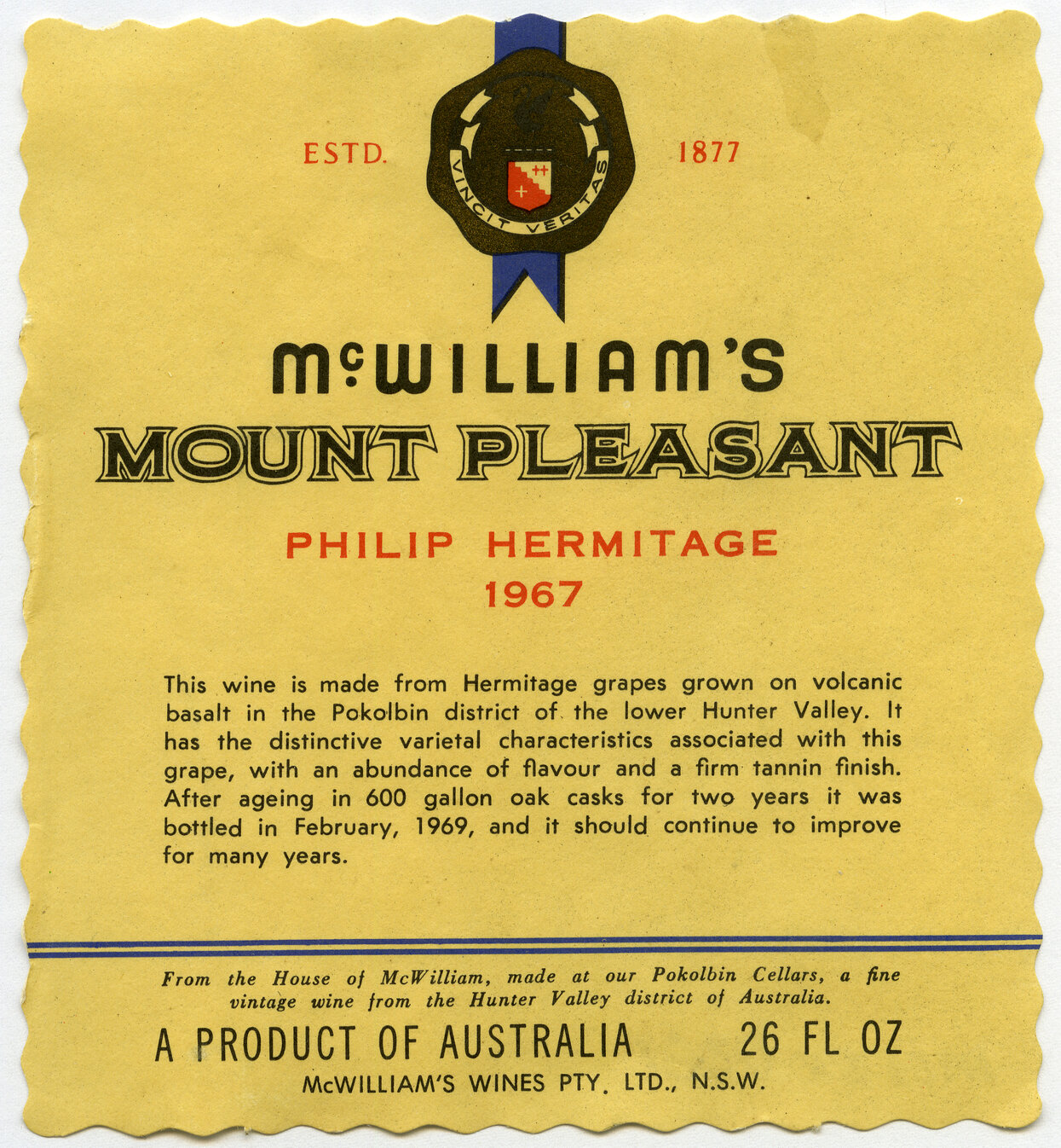 McWilliam's Mount Pleasant Label (1967) (1967). Living Histories, accessed 13/02/2026, https://livinghistories.newcastle.edu.au/nodes/view/61123