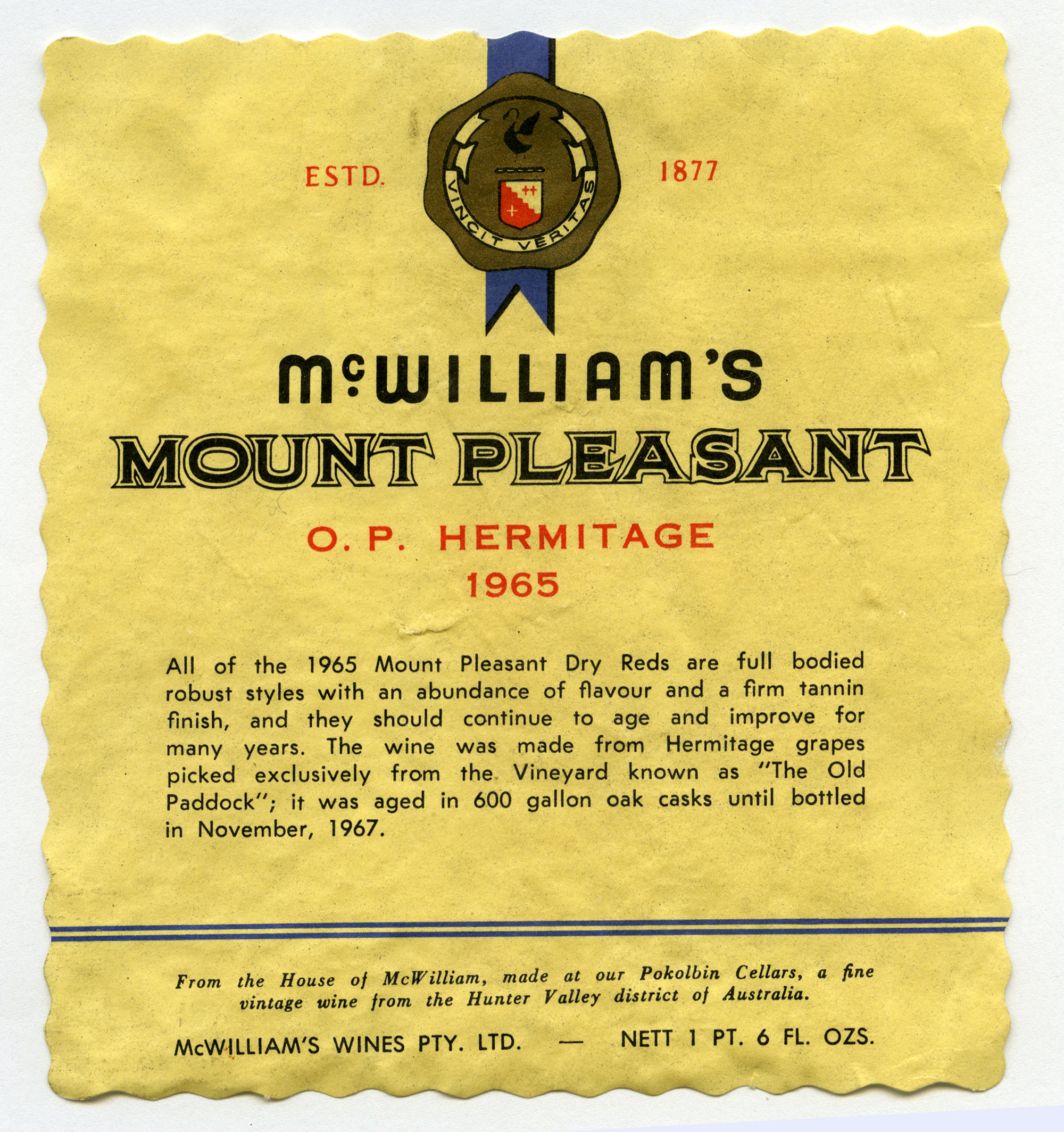 McWilliam's Mount Pleasant Label (1965) (1965). Living Histories, accessed 12/02/2026, https://livinghistories.newcastle.edu.au/nodes/view/61148