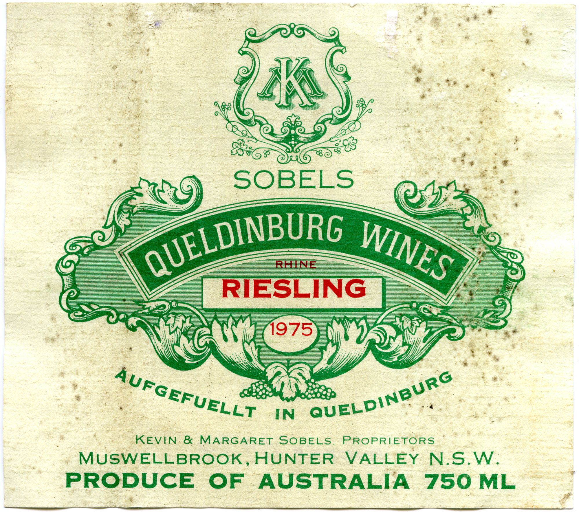 Label reads: "Sobels. Queldinburg Wines. Rhine Riesling. 1975. Aufgefuellt in Queldinburg. Kevin and Margaret Sobels, proprietors. Muswellbrook, Hunter Valley N.S.W. Produce of Australia 750ml."