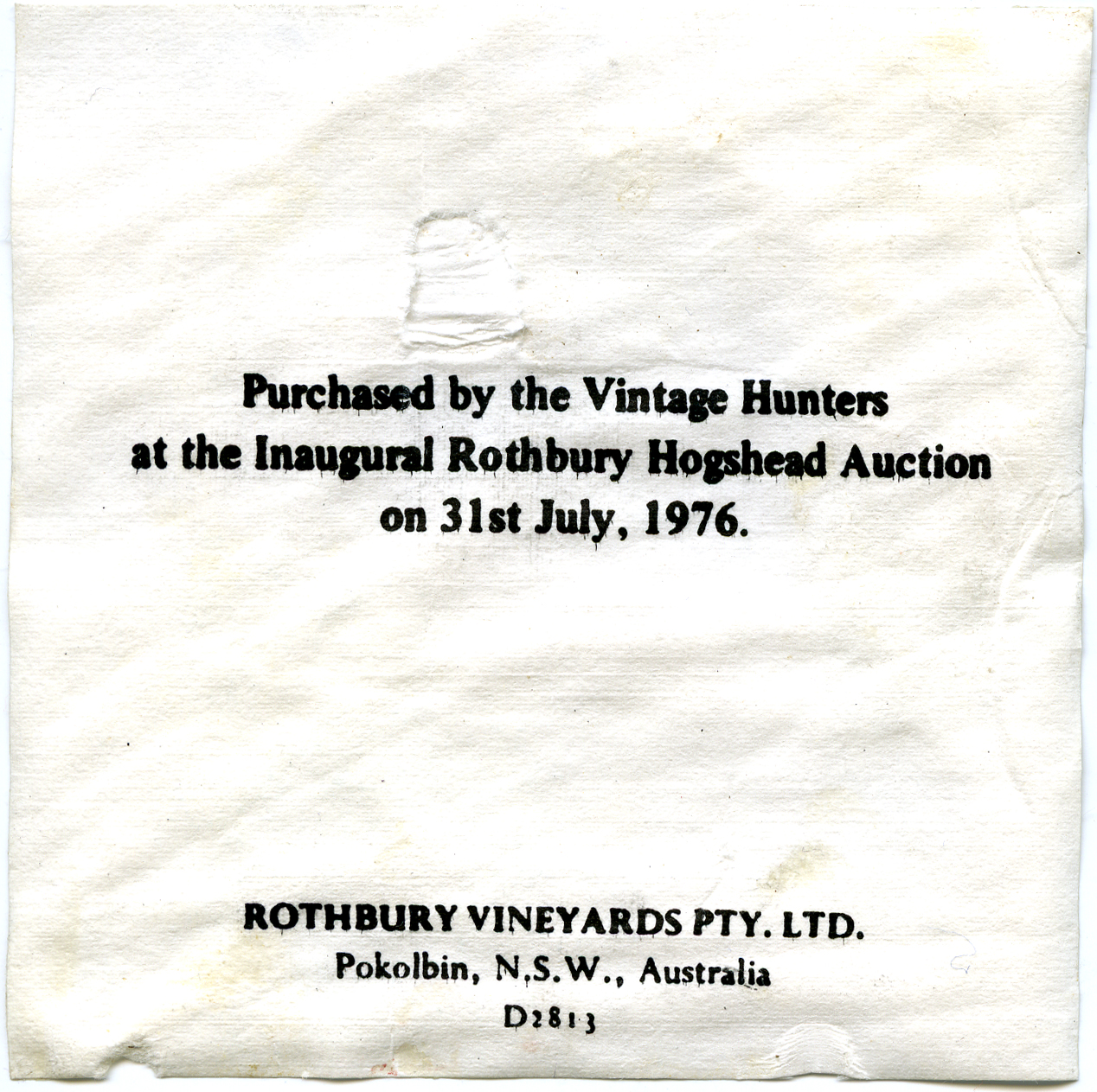 Date1976Wine MakerGary SissinghWineryRothbury Estate VineyardCollectorMorse, AllanLanguageEnglishDescriptionLabel reads: "Purchased by the Vintage Hunters at the Inaugural Rothbury Hogshead Auction on 31st July, 1976. Rothbury Vineyards PTY. LTD. Pokolbin, N.S.W., Australia."