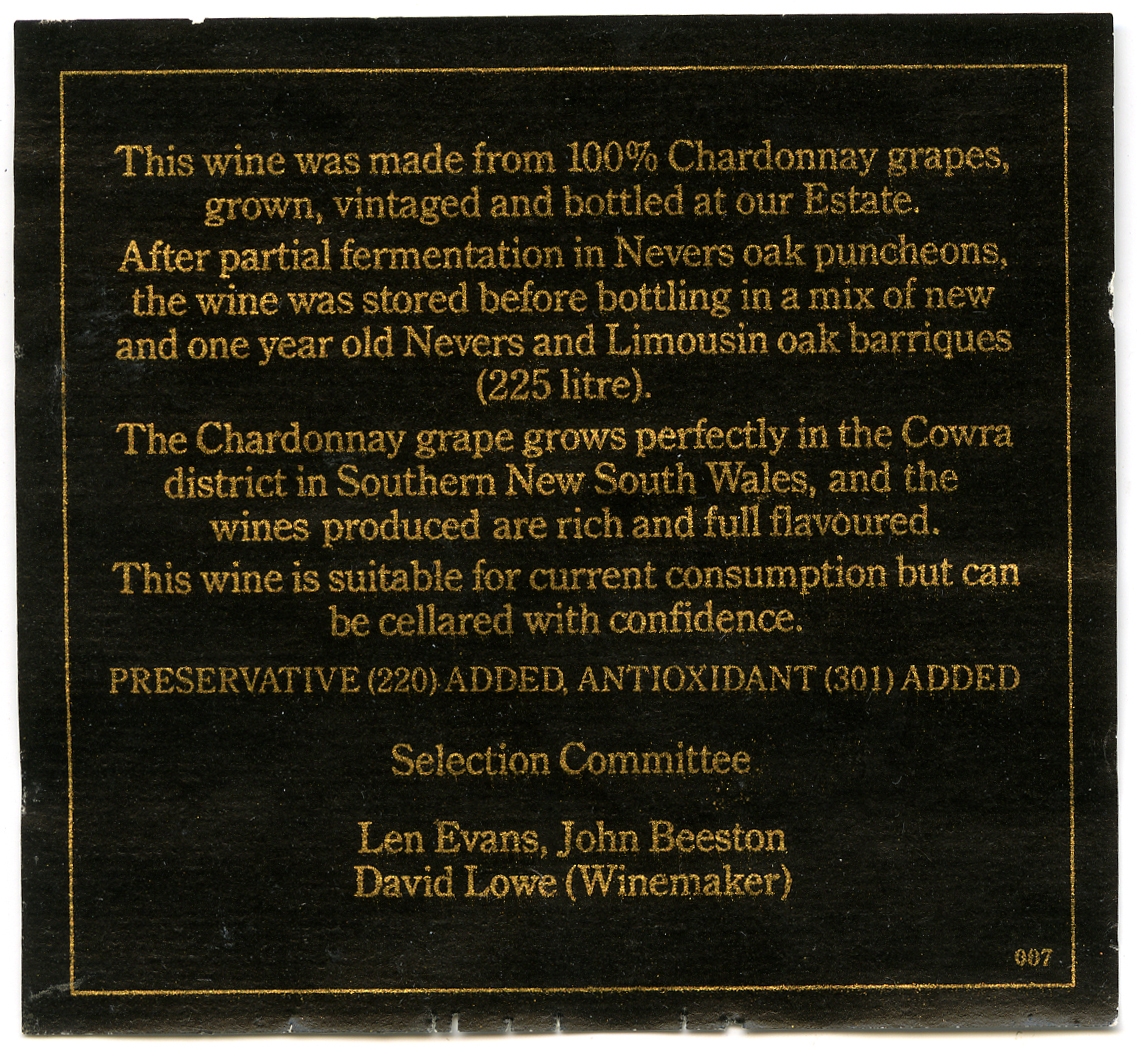 Label reads: "This wine was made from 100% Chardonnay grapes, grown, vintaged and bottled at our Estate. After partial fermentation in Nevers oak puncheons, the wine was stored before bottling in a mix of new and one year old Nevers and Limousin oak barriques (225 litre). The Chardonnay grape grows perfectly in the Cowra district in Southern New South Wales, and the wines produced are rich and full flavoured. This wine is suitable for current consumption but can be cellared with confidence. Preservative (220) added, antioxidant (301) added. Selection Committee: Len Evans, John Beeston, David Lowe (Winemaker)."