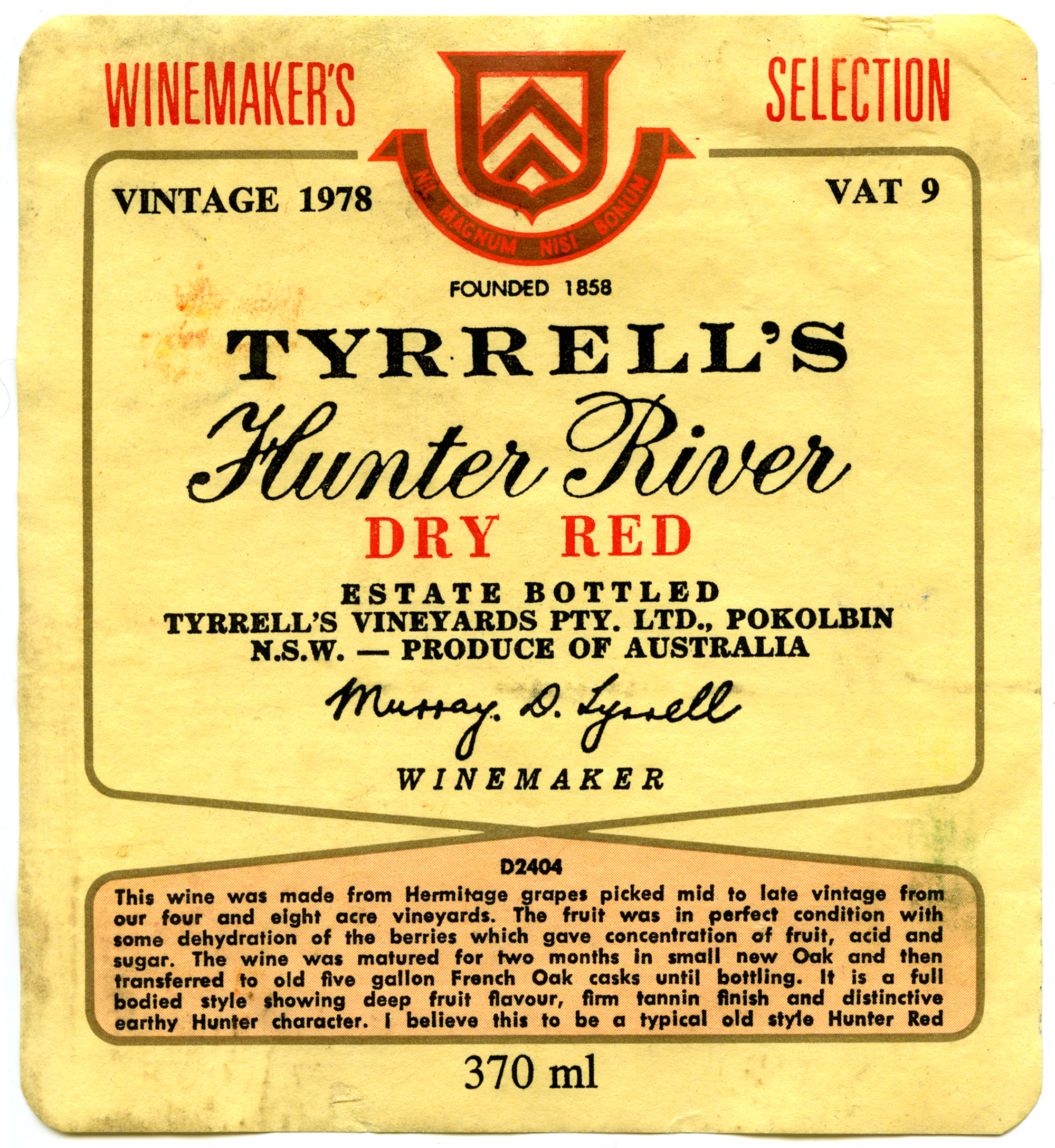 Label reads: "Winemakers selection. Vintage 1978 vat 9. Tyrrell's Hunter River Dry Red. Estate bottled. Tyrrell's Vineyards PTY LTD., Pokolbin N.S.W. Produce of Australia. Murray D. Tyrrell Winemaker. This wine was made from Hermitage grapes picked mid to late vintage from out four and eight acre vineyards. The fruit was in perfect condition with some dehydration of the berries which gave concentration of fruit, acid and sugar. The wine was matured for two months in small new Oak and then transferred to old five gallon French Oak casks until bottling. It is a full bodied style showing deep fruit flavour, firm tannin finished and distinctive earthy Hunter character. I believe this to be a typical old style Hunter Red. 370ml. ."
