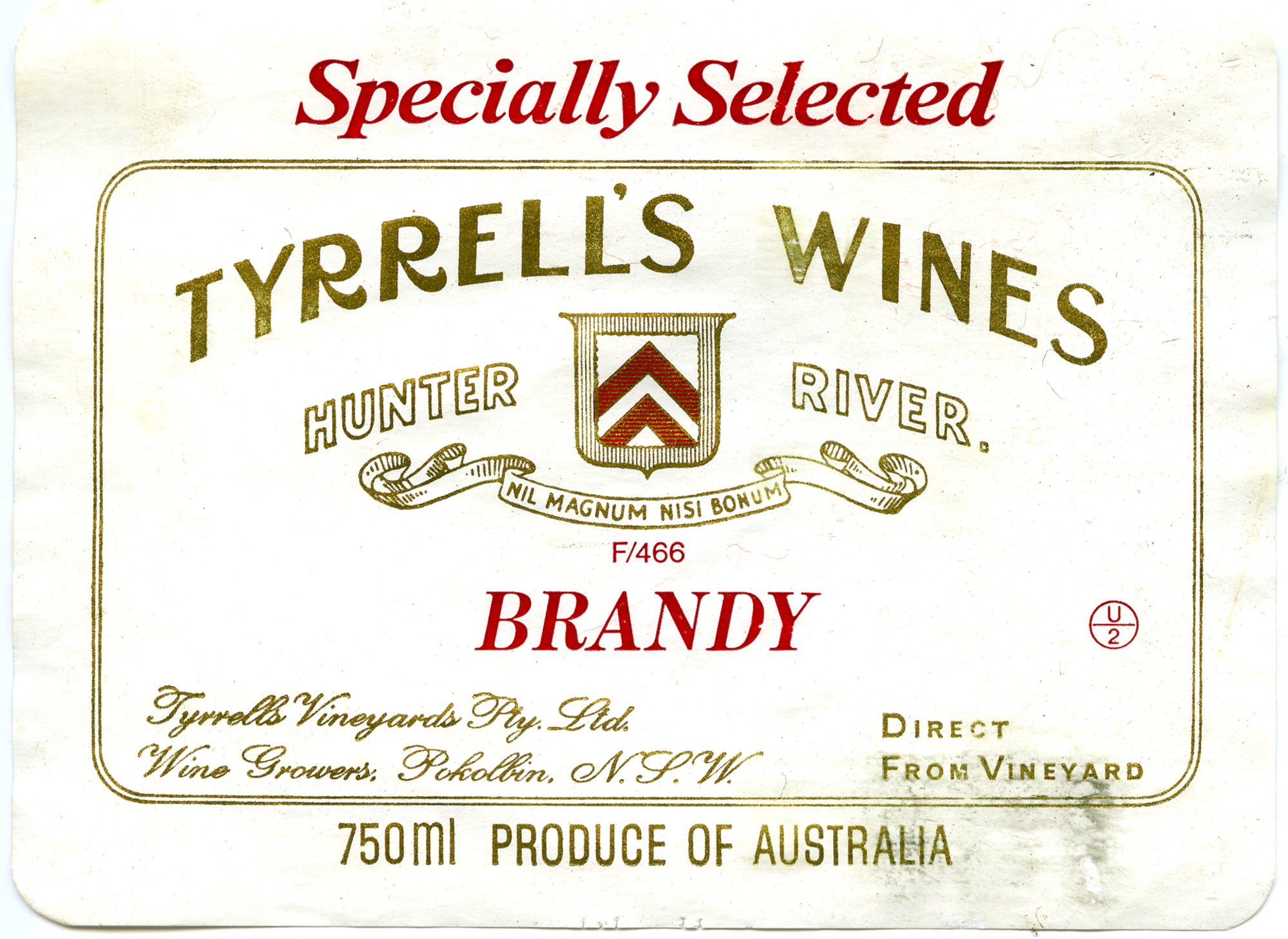 Label reads: "Specially selected. Tyrrell's. Brandy. Tyrrell's Vineyards PTY LTD., Wine Growers, Pokolbin N.S.W. Direct from vineyard. 750ml. Produce of Australia."
