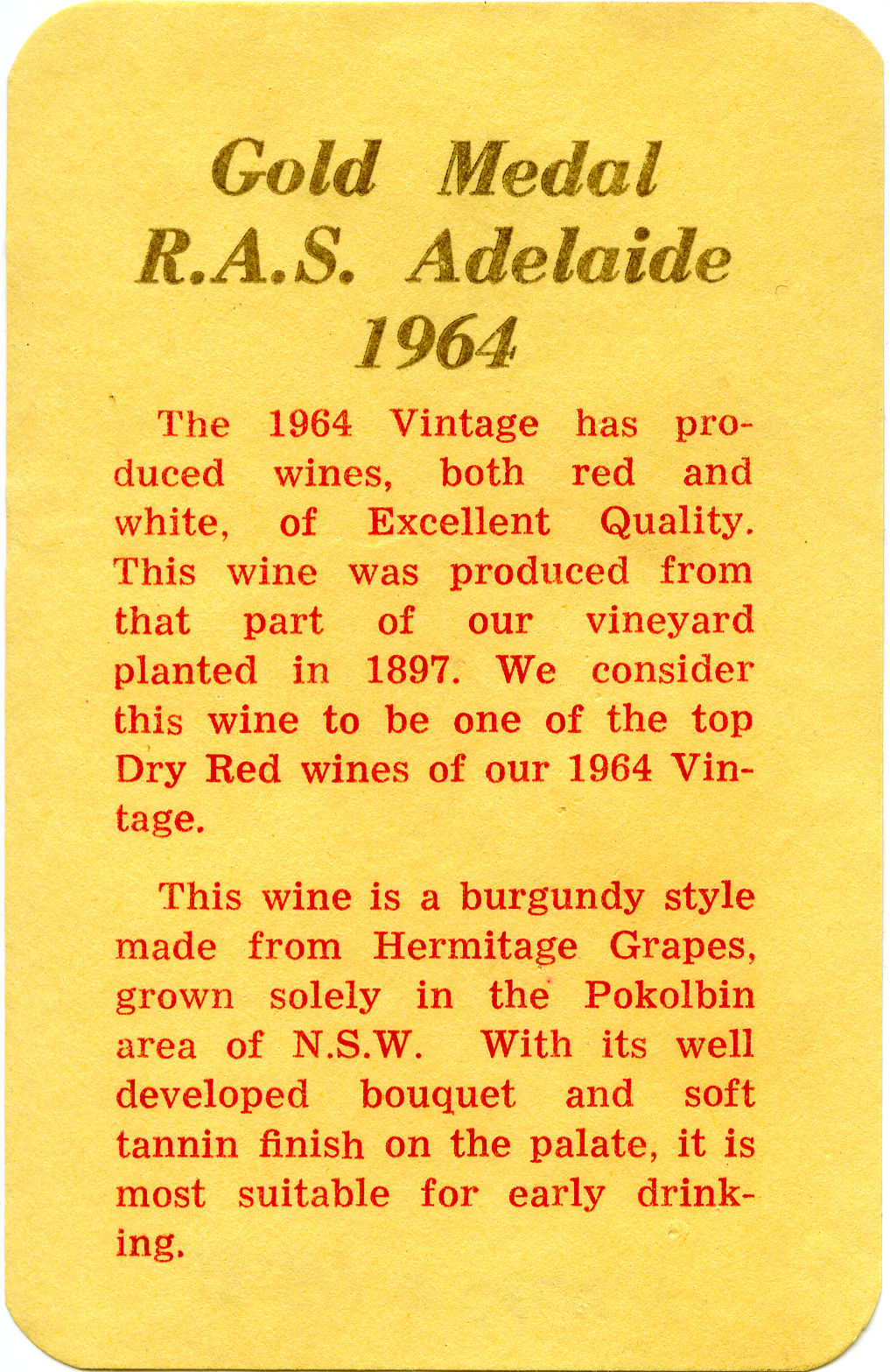 Label reads: "Gold Medal R.A.S. Adelaide 1964. The 1964 Vintage has produced wines, both red and white, of Excellent Quality. This wine was produced from that part of our vineyard planted in 1897. We consider this wine to be one of the top Dry Red wines of our 1964 Vintage. This wine is of a burgundy style typical of wines made from Hermitage Grapes, grown solely in the Pokolbin are of N.S.W. With its well-developed bouquet and soft tannin finish on the palate it is most suitable for early drinking."