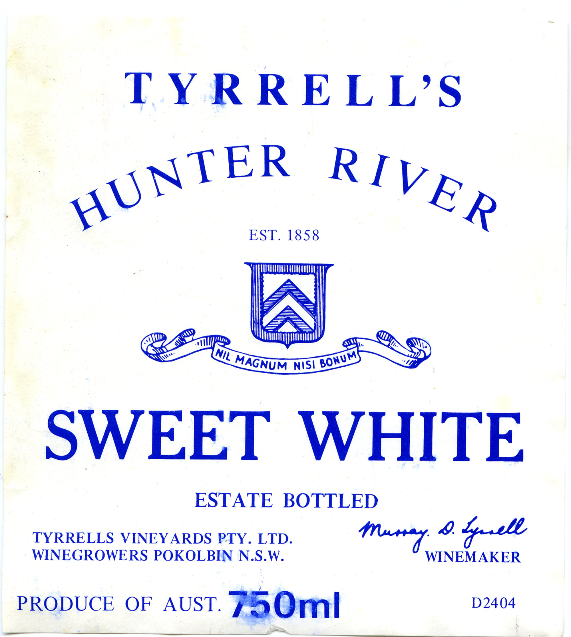Label reads: "Tyrrell's Hunter River Sweet White. Est 1858. Estate bottled. Tyrrell's Vineyards PTY LTD., Winegrowers Pokolbin N.S.W. Produce of Australia. 750ml. Murray Tyrrell, winemaker."