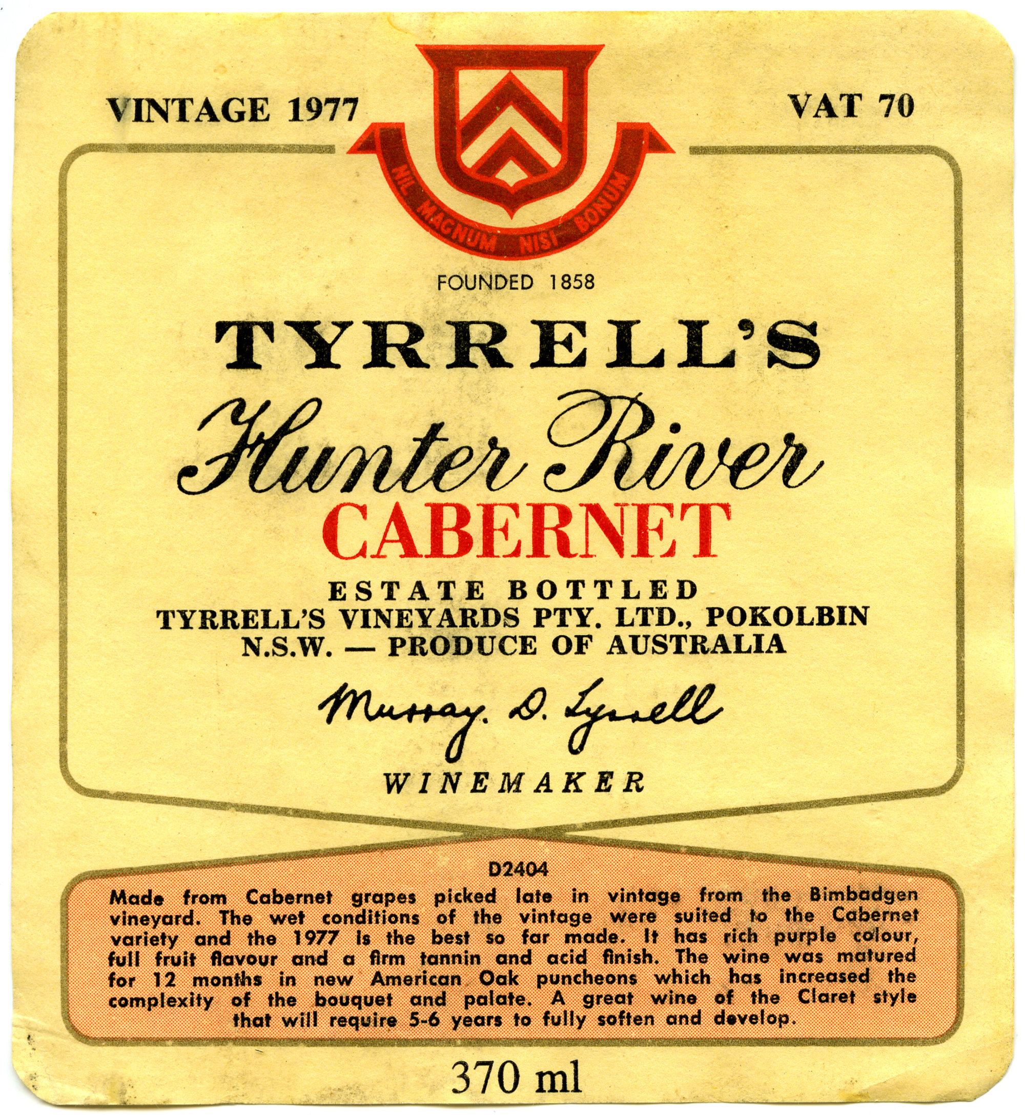 Geotag[1] SubjectMORSE1198Tyrrell's WinesWine Labels -- New South Wales -- Hunter River ValleyWine labels -- DesignWine industry -- AustraliaWine -- MarketingVisual communicationInstructionscopy. tyrrell's hunter river cabernet vintage 1977 vat 70CollectionMorse Wine Labels