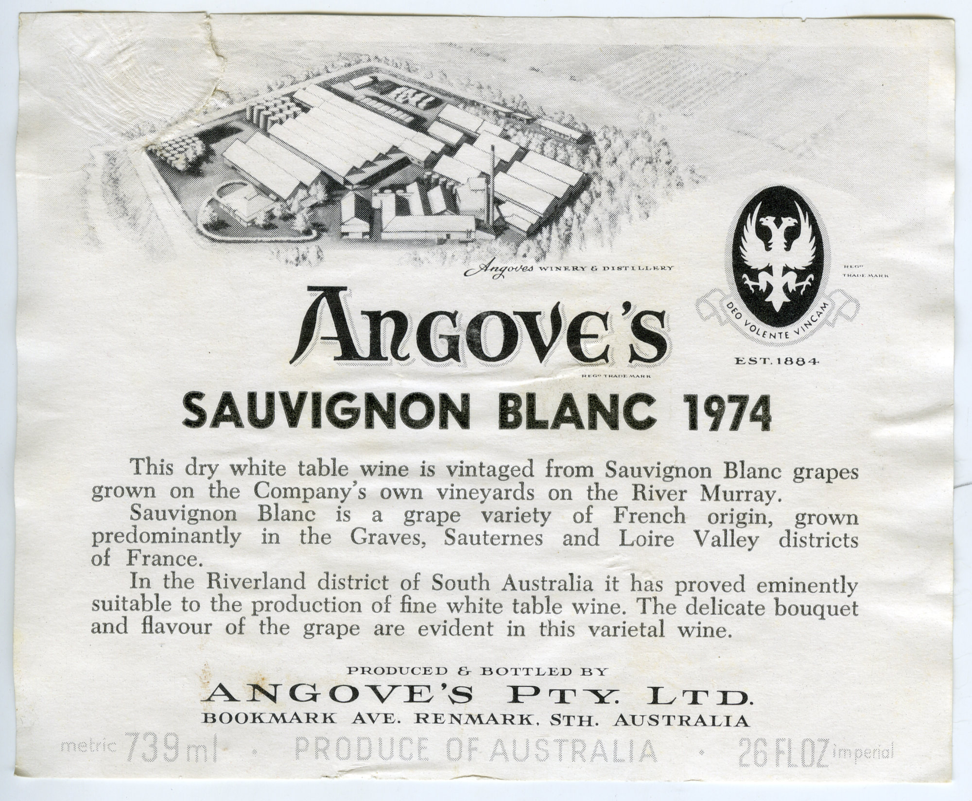 Angove's wine label for a bottle of Sauvignon Blanc (1974)