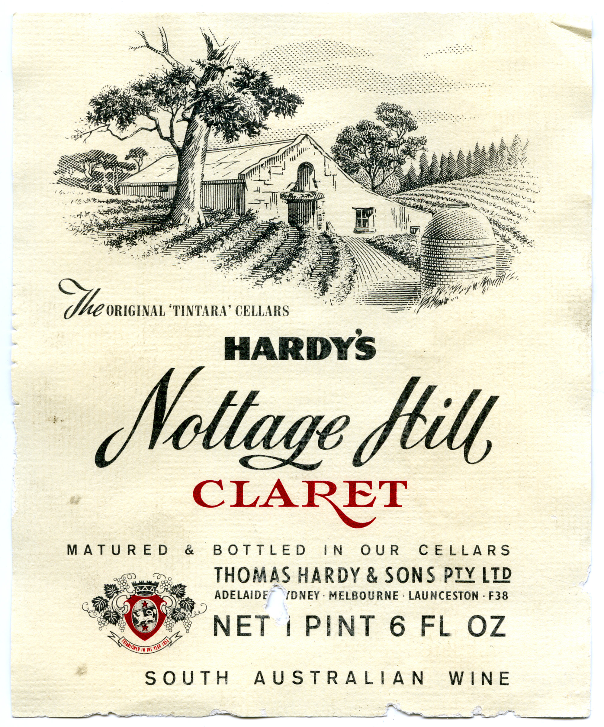 Label reads: "The original 'Tintara' Cellars. Hardy's. Nottage Hill. Matured and bottled in our cellars. Thomas Hardy and Sons Pty. Ltd. Adelaide, Sydney, Melbourne, Launceston. F38. Net 1 pint 6 fl. Oz. South Australian wine."