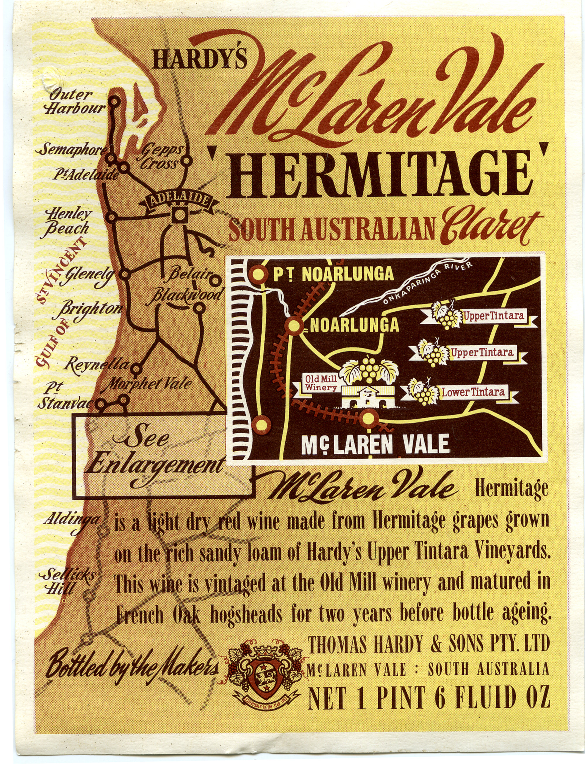 Hardy's wine label for a bottle of 'Hermitage' Claret [n.d.]. Living Histories, accessed 20/04/2026, https://livinghistories.newcastle.edu.au/nodes/view/61657