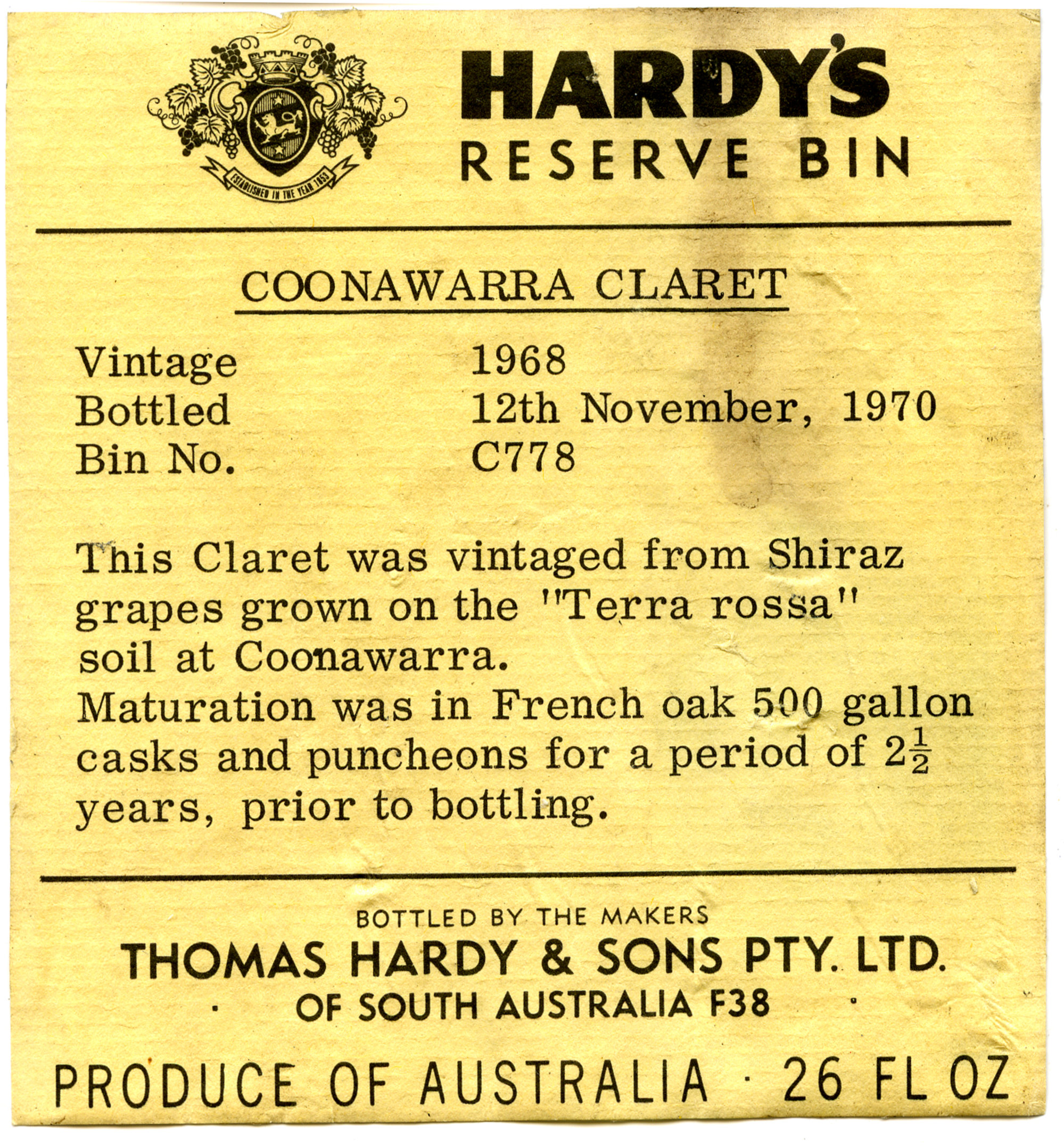 Hardy's wine label for a bottle of Coonawarra Claret (1970)