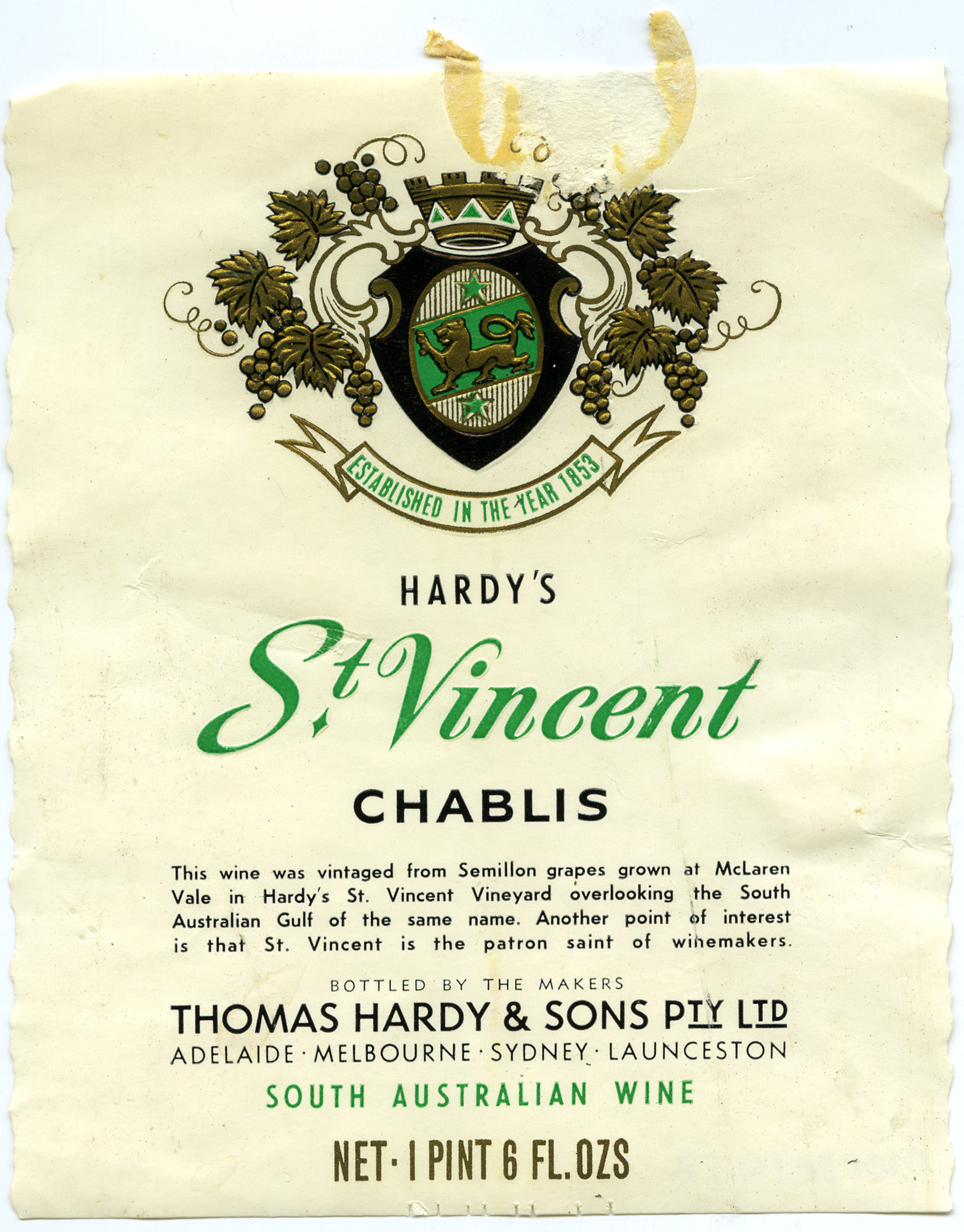 Hardy's wine label for a bottle of St. Vincent Chablis [n.d.]. Living Histories, accessed 15/04/2026, https://livinghistories.newcastle.edu.au/nodes/view/61737