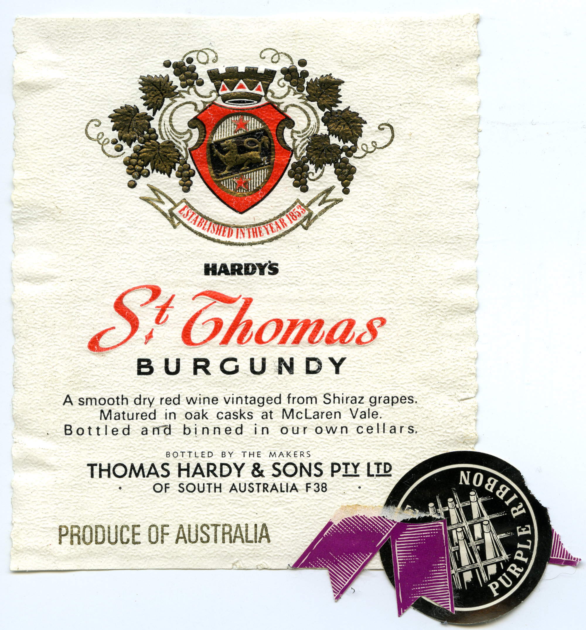 Hardy's wine label for a bottle of St. Thomas Burgundy [n.d.]. Living Histories, accessed 15/04/2026, https://livinghistories.newcastle.edu.au/nodes/view/61738
