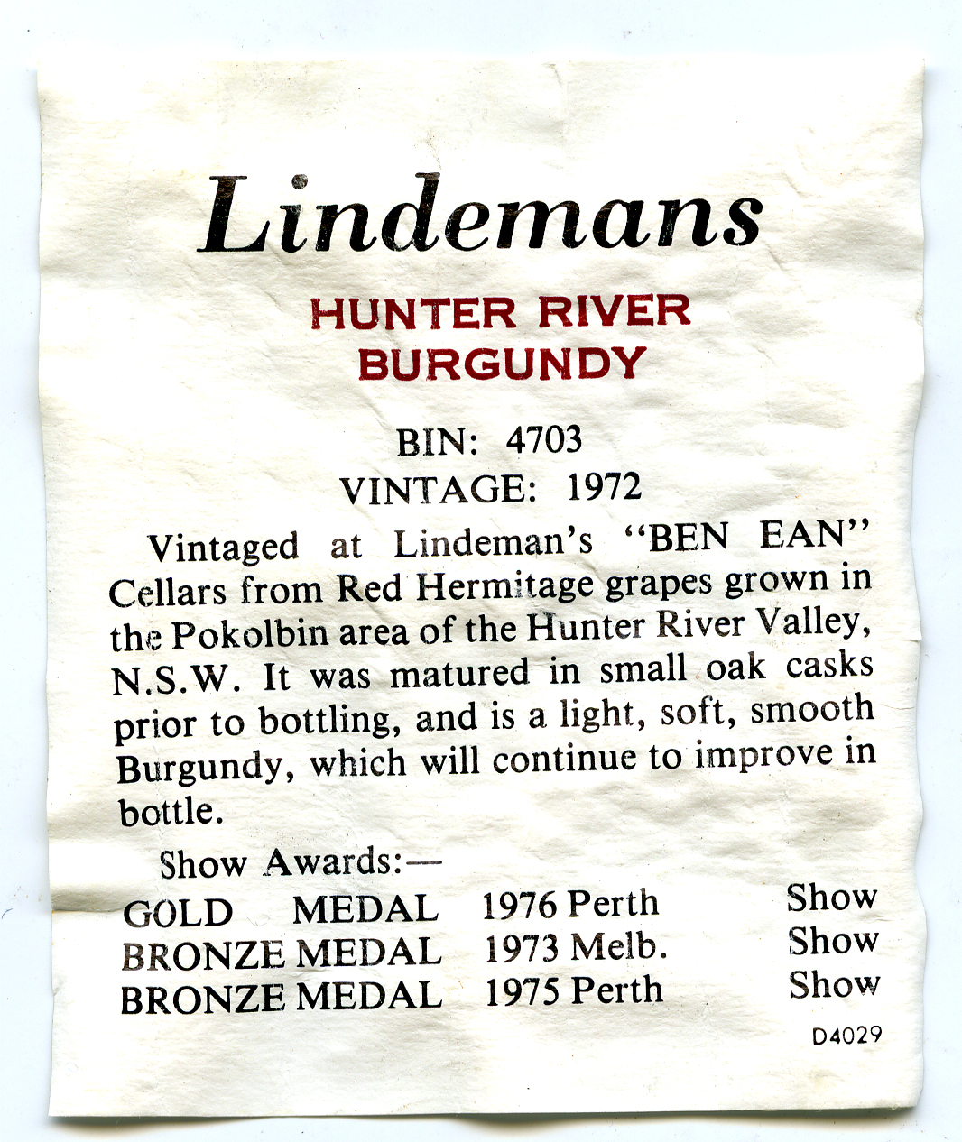 Lindemans Hunter River Burgundy Label (1972) (1972). Living Histories, accessed 20/01/2026, https://livinghistories.newcastle.edu.au/nodes/view/61773